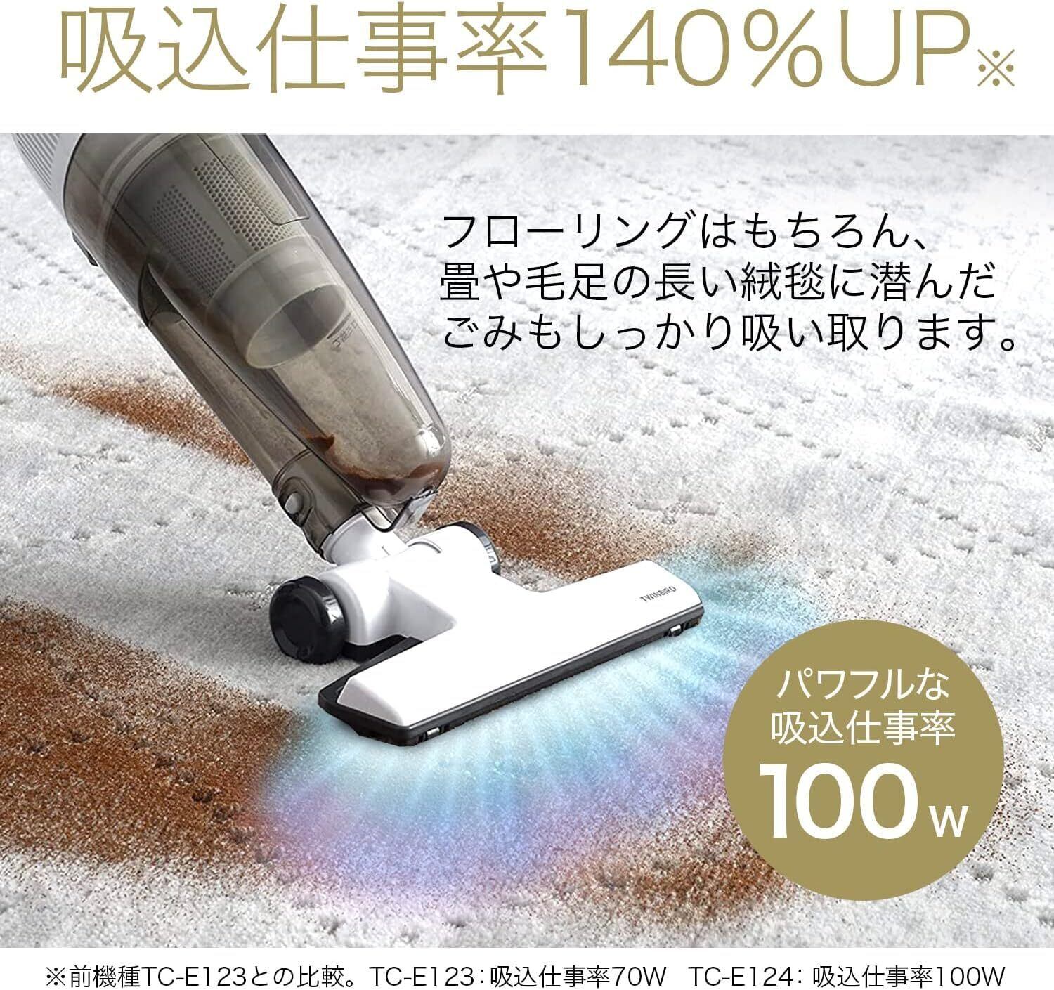 TC-E124は、軽量1.7kg、吸込仕事率100Wの軽さとパワーを兼ね備えた、シンプルなスティッククリーナーです。ハンドルを外せば、ハンディクリーナーとしても使える2WAY仕様。スティックの時もハンディの時も手元にスイッチが来るよう、配置を工夫しました。シンプルな使いやすさを追求した、一人暮らしにおすすめの掃除機です。