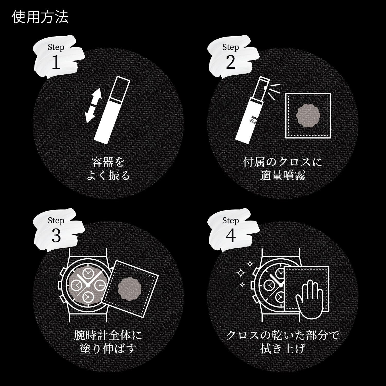 ガラス系特殊ハイブリッドコート配合。コーティング被膜を形成し、腕時計を保護し汚れをつきにくくします。