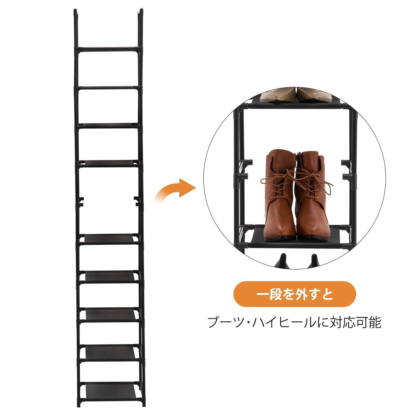 【棚数を自由にアレンジ】お好みのように棚の数を自由に調整し、2つの靴収納ラックに分けて異なる部屋に配置するできます。一つの棚は取り外せて、ブーツなども収納可能です。お勧め:棚の数が多い場合、下から上まで重い靴を置いたら安定性がよりよいです。