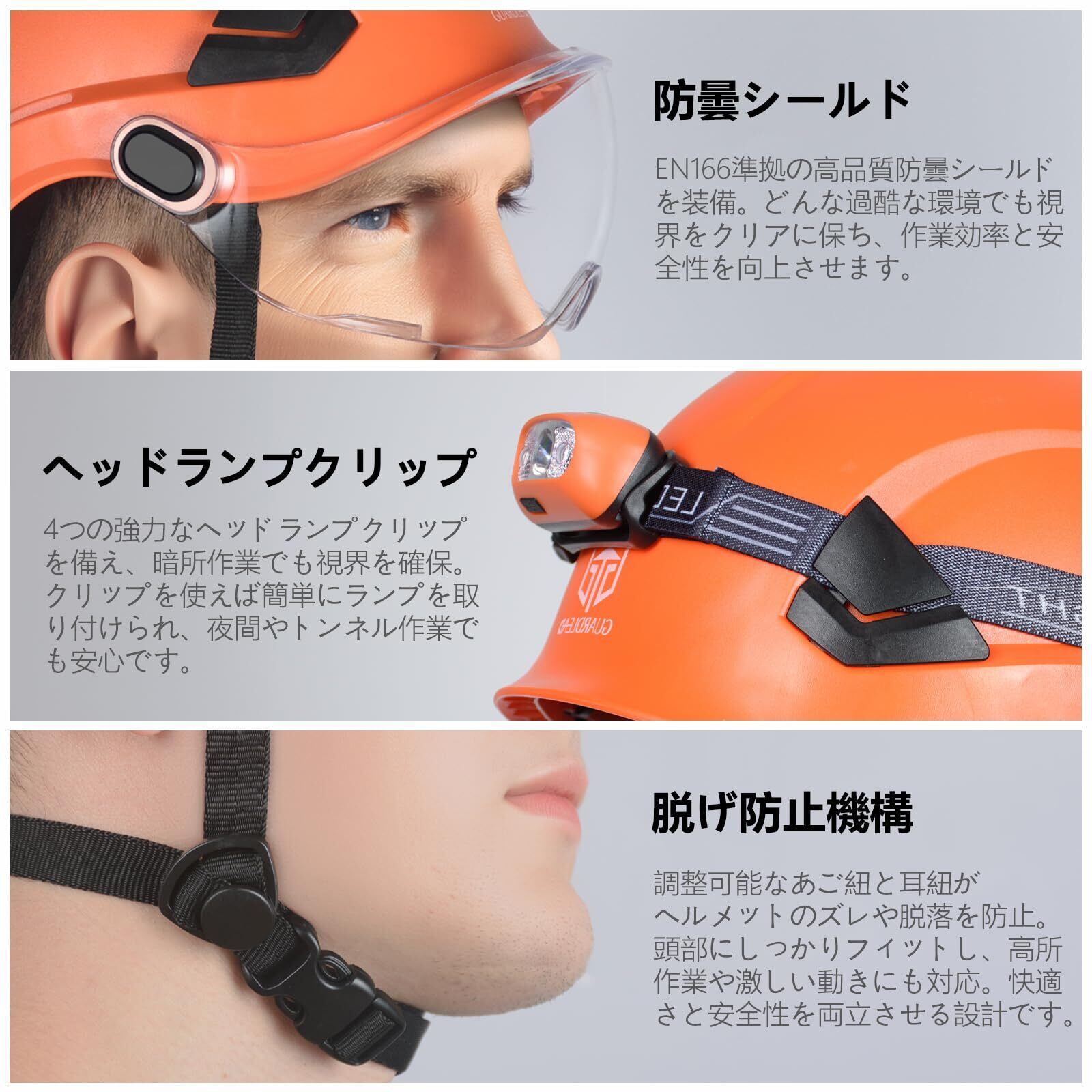 ️ 【安全性と快適性を両立】オレンジ色のヘルメットは視認性が高く、夜間の安全性をさらに高めるためにトップとサイドに銀色の反射テープが配置されています。4つのヘッドランプクリップを装備しており、夜間作業にも非常に便利です。また、アゴバンドの耳紐がヘルメットのズレや脱落を防止し、バックルで簡単に取り外しができます。