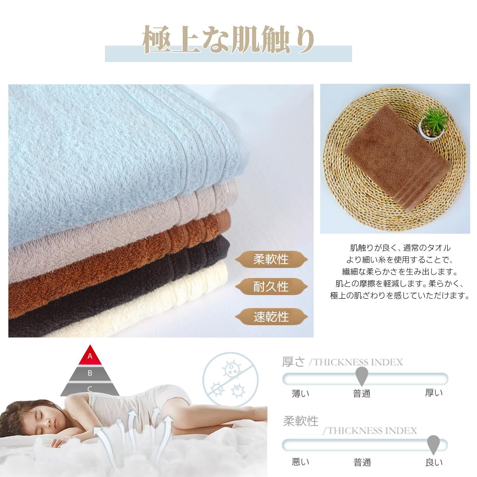 【優れた吸水力と速乾性】素材の表面は数えられない隙間があり、その隙間に大量の水分を素早い吸水できます。吸水力は普通のバスタオルより何倍もあり、吸水性が抜群です。手に取った際に、見た目よりも軽く、驚く程のエアリー感があります。軽いから乾きも早く、部屋干しでもしっかり乾きます。生乾きの嫌な臭いの心配もいりません。 また、綿100%の商品なので、安心してお使いいただけます。