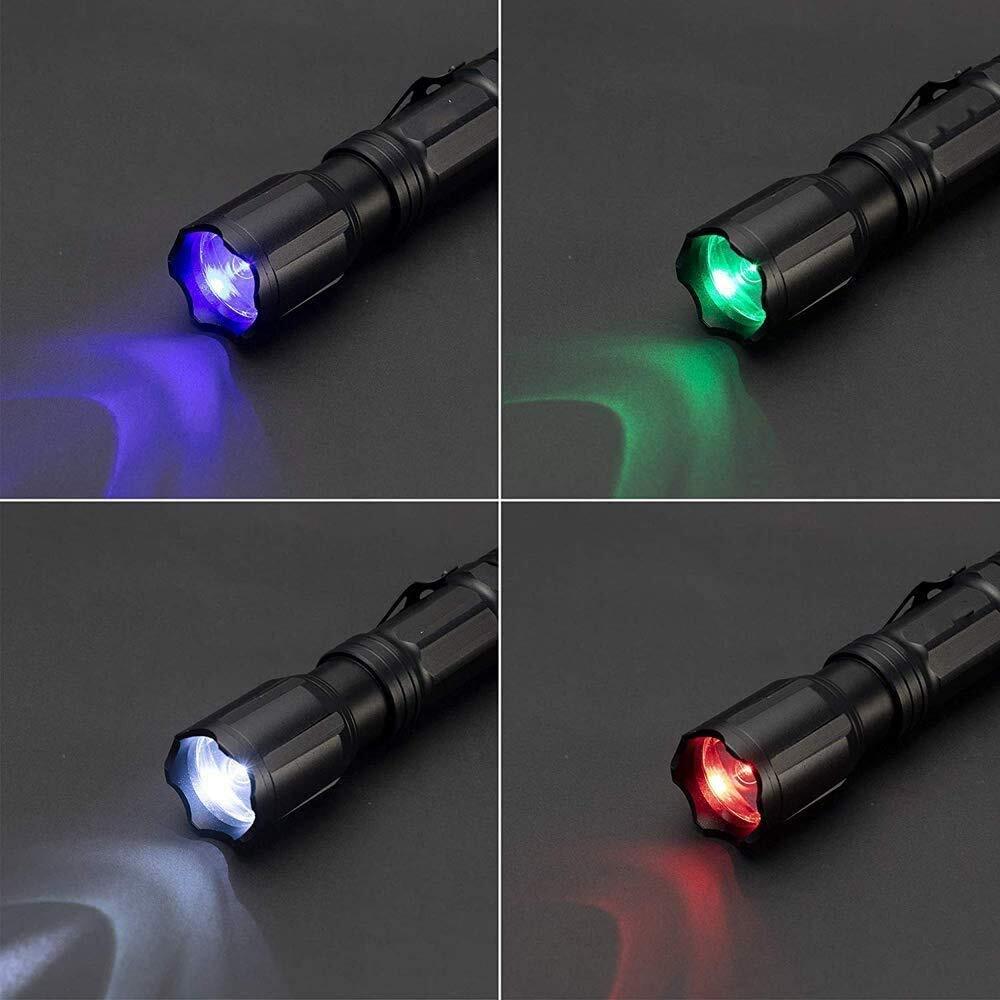 【用途が広い】4つの異なる光色の懐中電灯に相当する4つの多色戦術懐中電灯。狩猟、天文学、星を見るための赤い光/緑の光。釣り用ブルーライト。キャンプ、ハイキング、日常使いのホワイトライト。