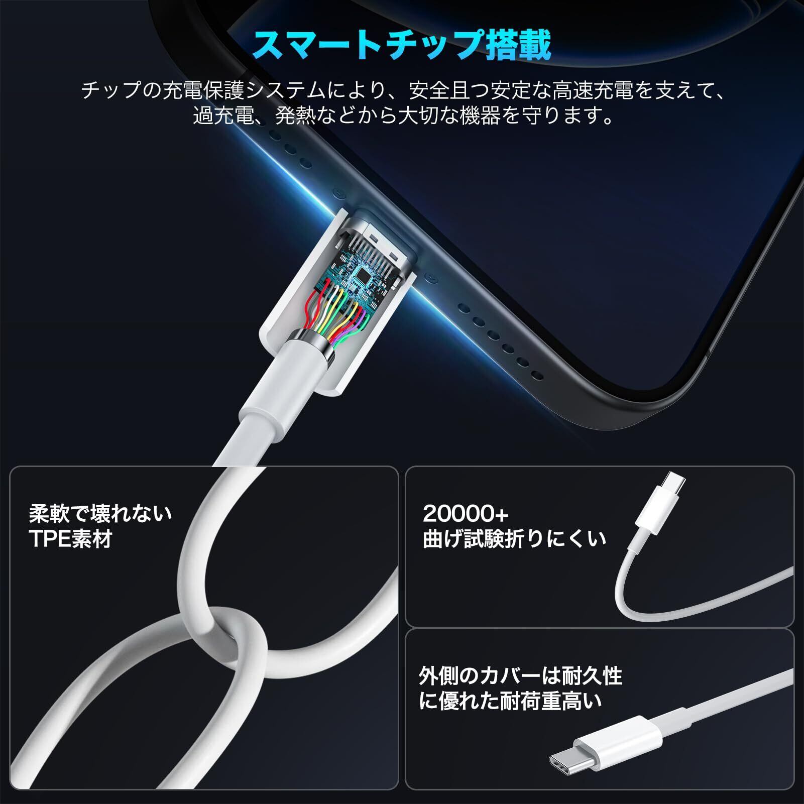 【安全保護】:コネクタ部分にスマートチップが内蔵されているため、接続された端末を自動的に検知し、デバイスに最も良い電流出力で充電します。伝導率の良い銅芯を採用した安全重視設計により、3Aの高出力を流せしかも過充電と発熱などを防ぎます。過電圧、過流、過熱、過電流、ショートや過負荷保護などのの多重保護で、ケーブルの安全性と信頼性を向上させます。