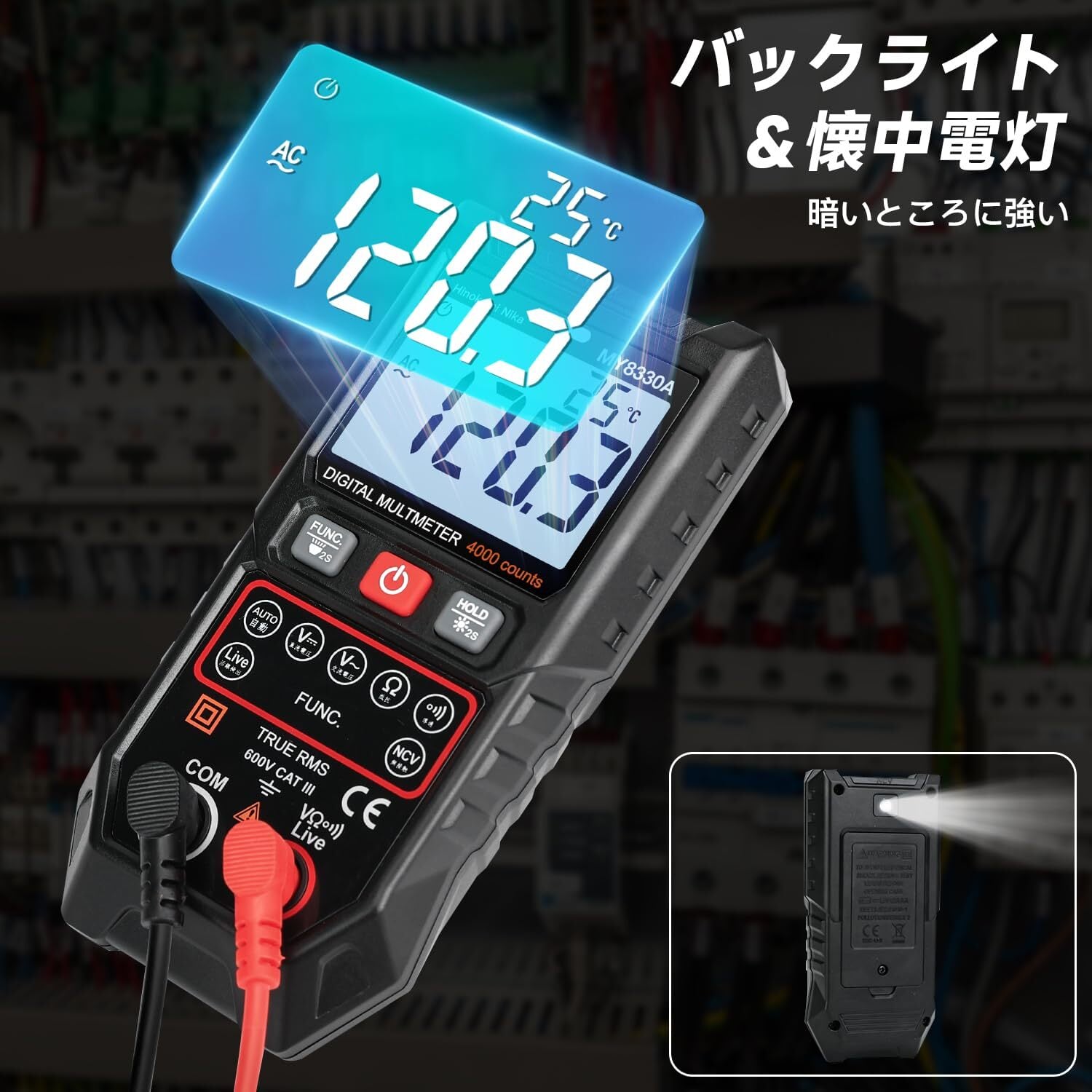 Hinokami Nika MY8330A テスター オート/マニュアル二重モード、4000カウント TRMS 超軽量 小型 市販唯一機能インジケーターデザイン、マルチメーター デジタル スマート測定オートレンジ、AC/DC電圧計 周波数 非接触電圧検知機能 温度表示 抵抗 連続性 収納ケース付き 3年