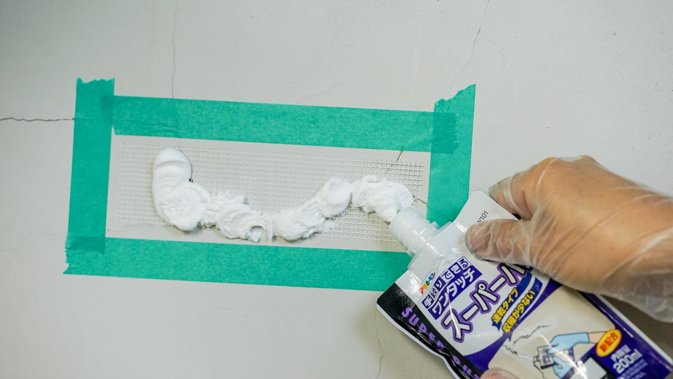 ●補修箇所に容器の口を押し当て、中身を押し出しながら充てんしていきます。あらかじめ補修箇所の周りにマスキングテープを貼っておくと、はみ出しを防ぐことができ、きれいに仕上がります。