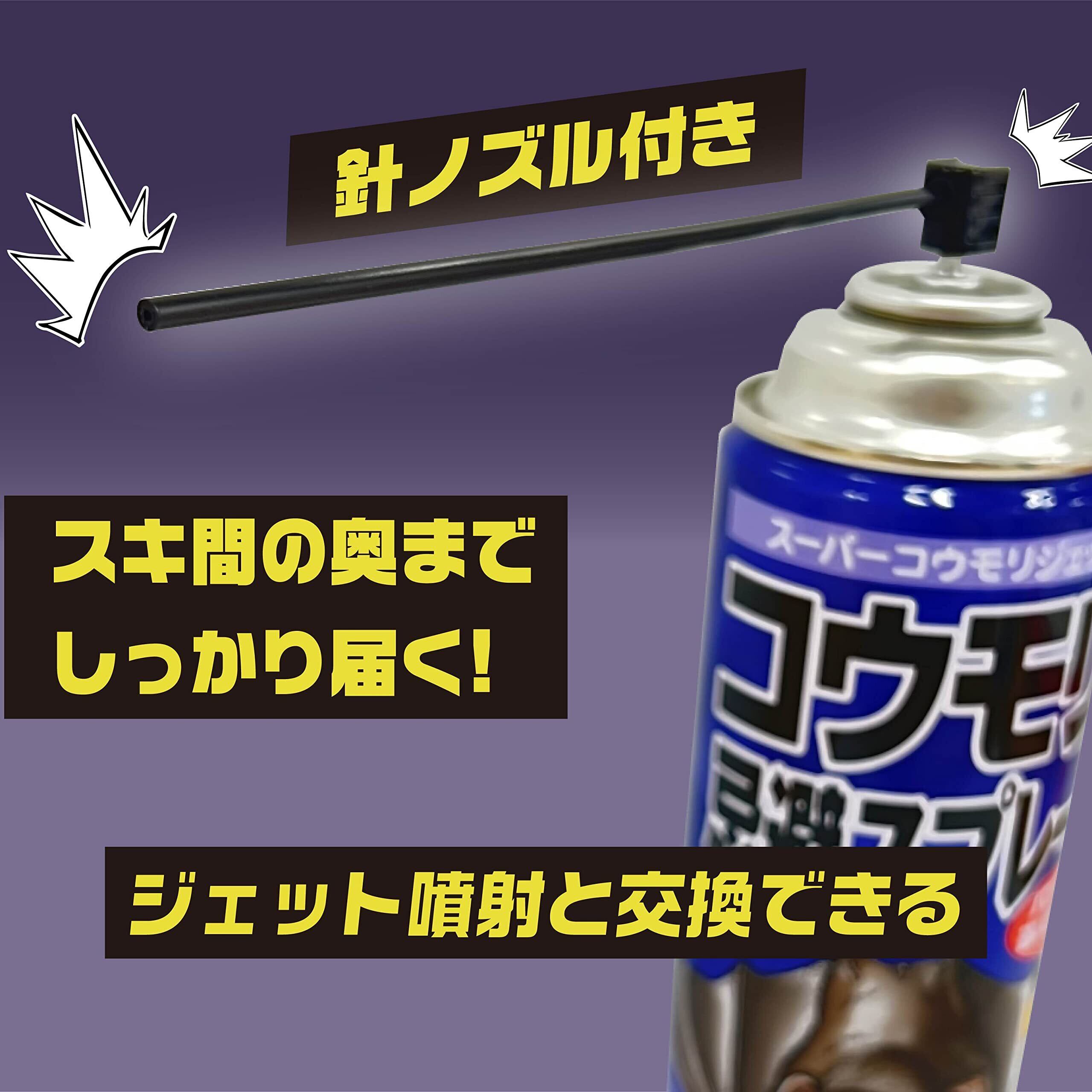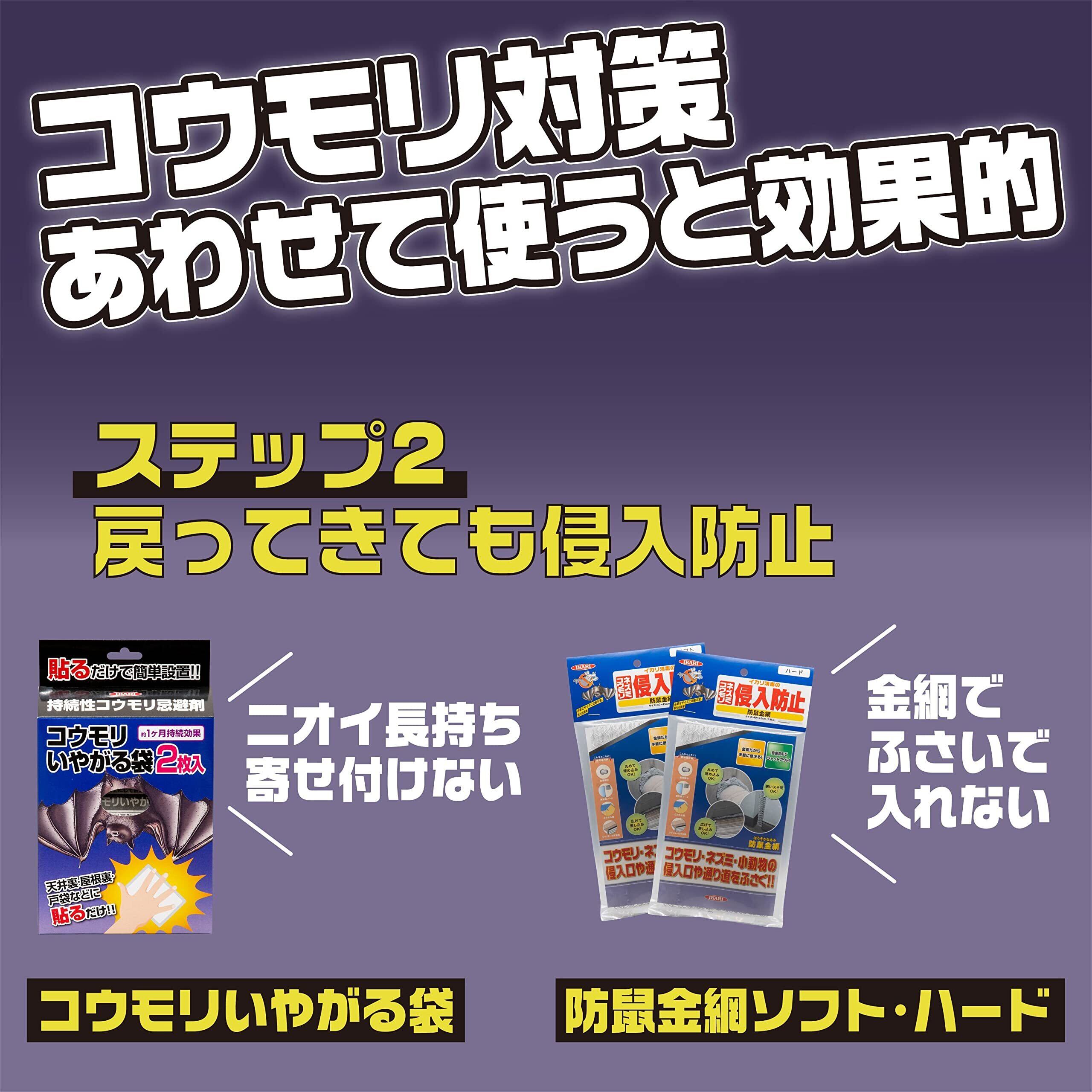【追い出し・忌避】 (1)屋根裏などコウモリが生息する場所に1平米当たり2~3秒の割合で噴霧してください。 (2)コウモリを追い出す際、スプレーを嫌がってコウモリが出ていくのを家の外から確認します。 ※ 追い出した後は、その穴やコウモリの出入口となっている部分を金網や板などでを防ぐことをおすすめします。効果がなくなった頃に再び戻ってくる場合があります。 【予防】 (1)コウモリの侵入を防ぎたい場所にはあらかじめ1平米あたり2~3秒の割合で噴霧してください。