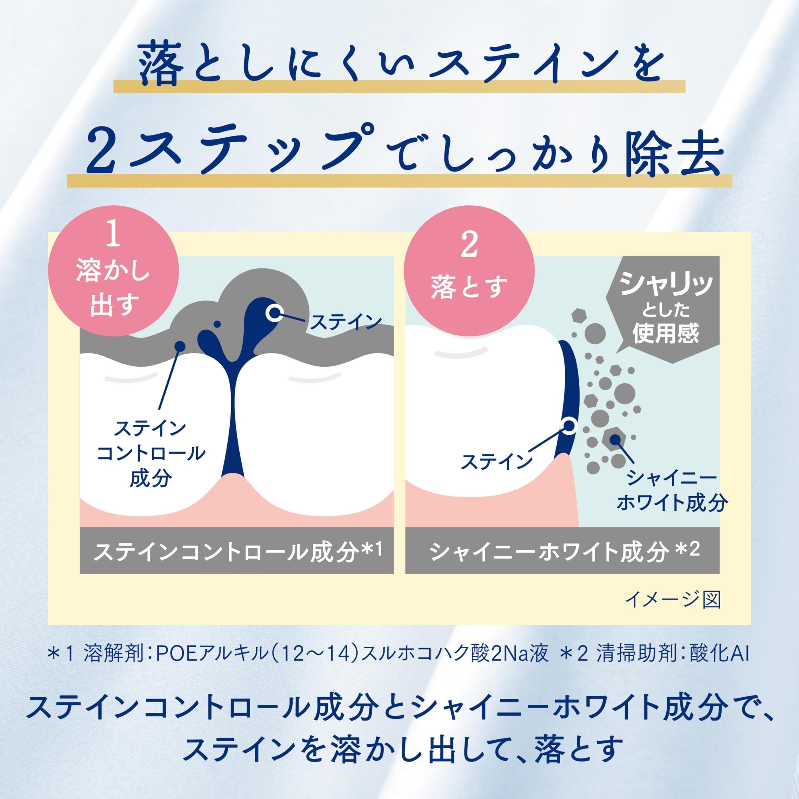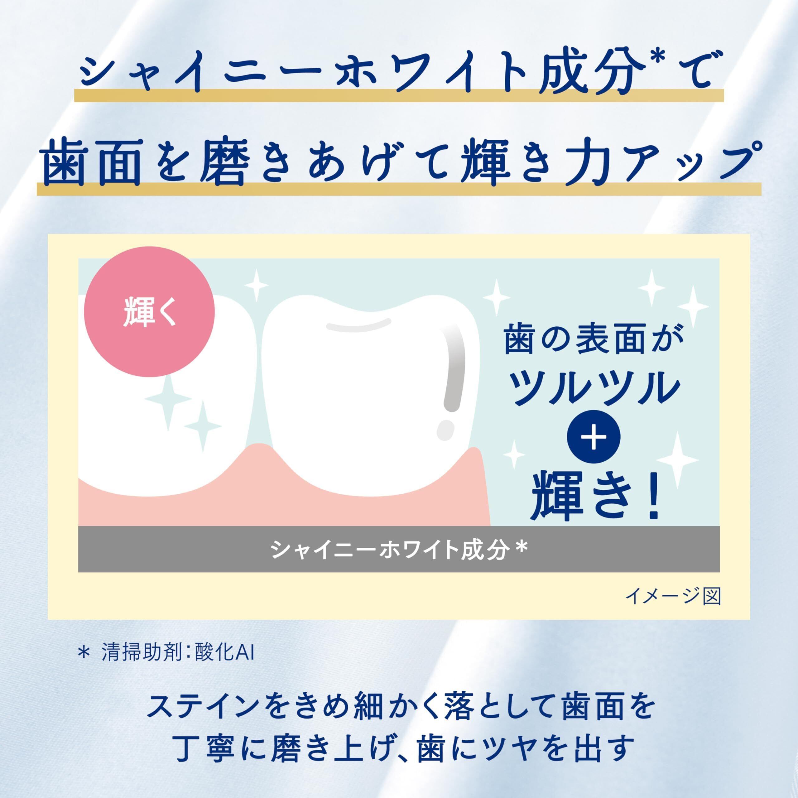 シャイニーホワイト成分(清掃助剤)が、清掃剤とともにステイン(着色汚れ)をきめ細かく落として歯面を丁寧に磨きあげ、白くつややかな歯にします。