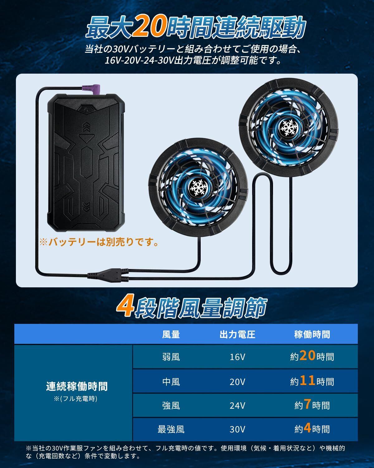 【4段階風量調整】弊社の30V 30000mAhバッテリーと組み合わせて、電源ボタンを約3秒長押しすると30V-24V-20V-16Vの4段階電圧出力が切り替え、4~20時間連続稼働を実現します。