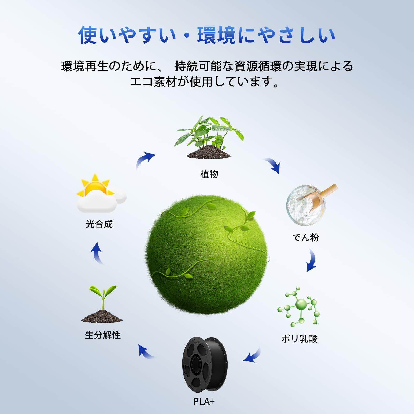 【安心安全】ANYCUBIC PLA Plusフィラメントは環境にやさしいエコな素材を原料として作られた3dプリンター用フィラメント造形素材です。生分解性プラにより無毒、匂いを最大限度に抑えて、室内での印刷や子供のおもちゃを作るにも安心安全です。