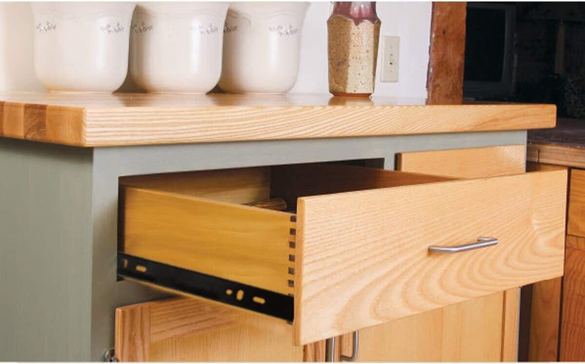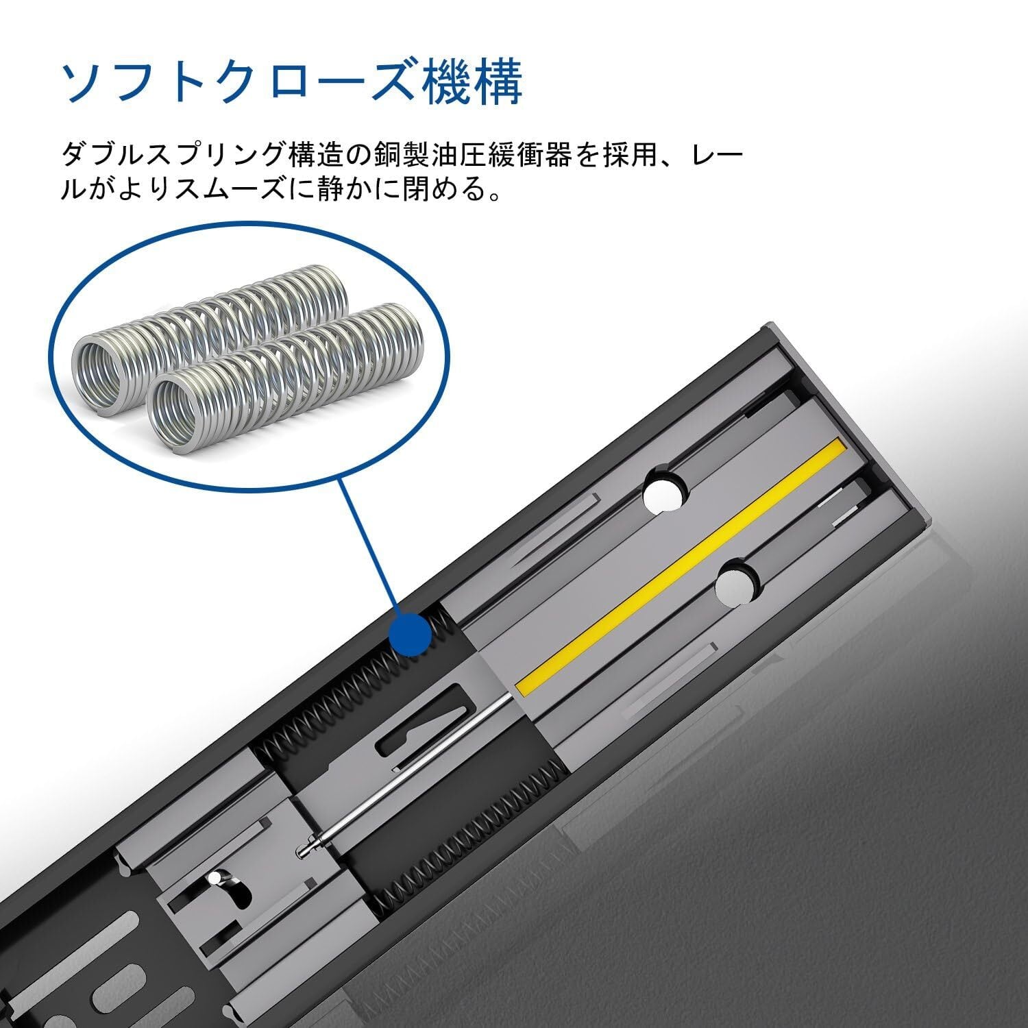 【ソフトクローズ】- この引き出しスライドには油圧バッファーが備わっており、引き出しが静かに静かに閉まり、バタンと閉まるのを防ぎます。特に寝室やベビールームに最適です。普通の引き出しスライドからアップグレードしましょう。