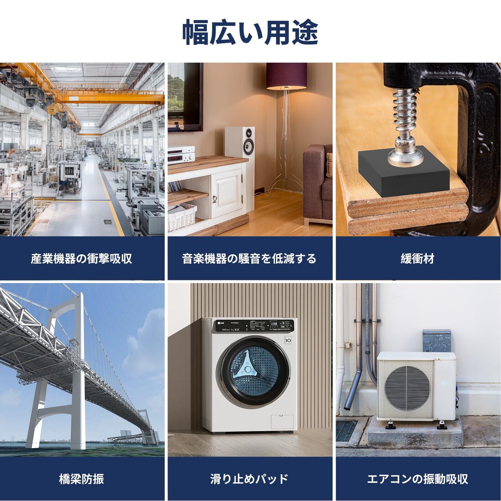 防振ゴム:洗濯機、エアコン室外機、産業機械などの機器の底にゴムブロックを置くと、これらの機器の振動騒音を効果的に低減できます。