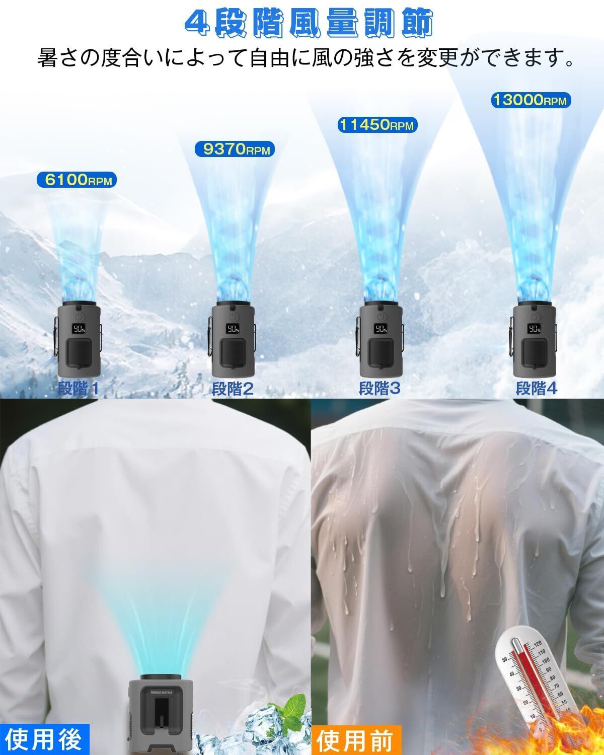 【4段階風量調節】首掛け扇風機の風量は4段階で調節が可能、暑さの度合いによって自由に風の強さを変更ができます。回転速度:段階1で約6100rpm、段階2で9370rpm、段階3で11450rpm、段階4で13000rpm。1~2段階の回転速度は普通の腰掛け扇風機の最高段に相当し、パワフルで涼しい風がどこでも快適に保ちま