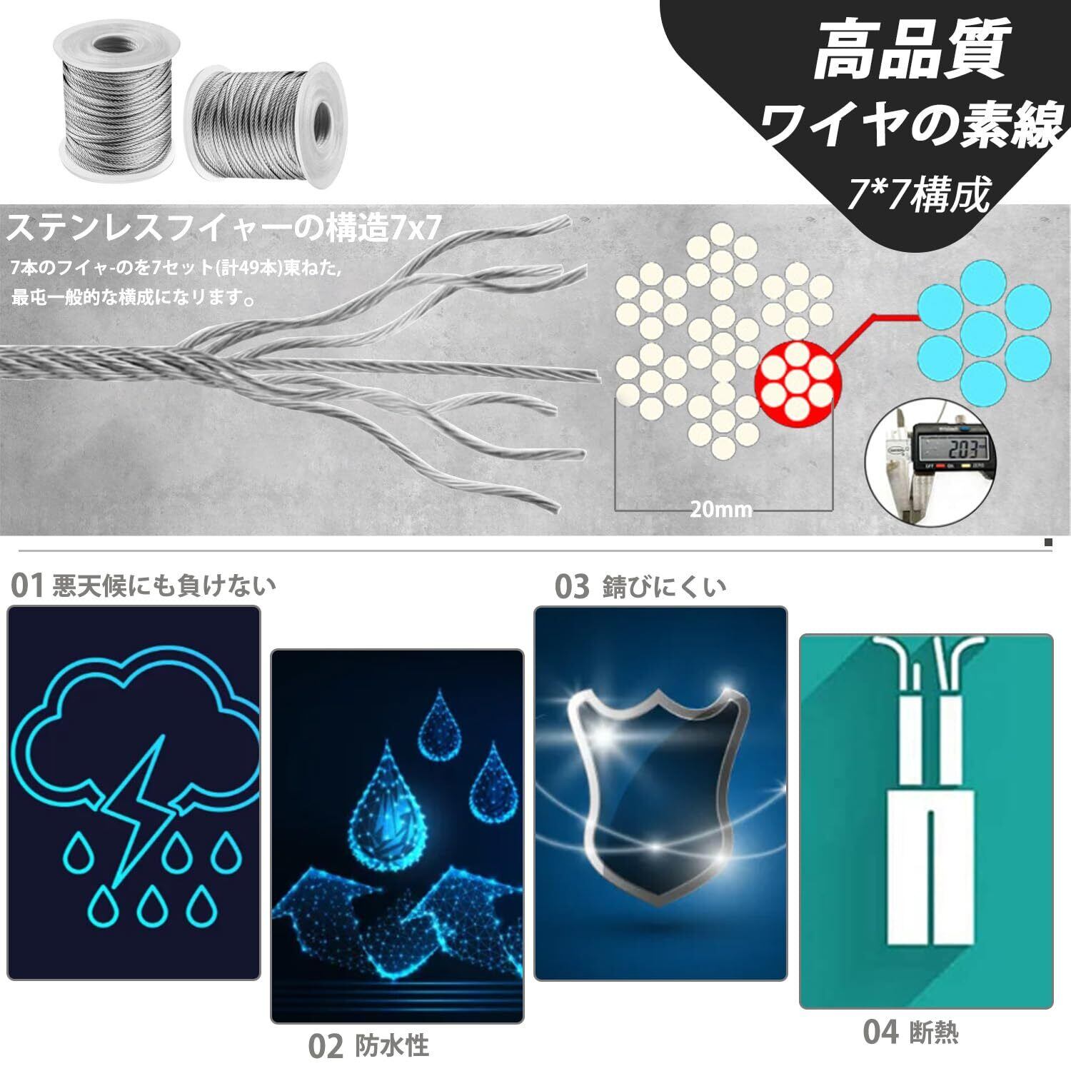 【ステンレスワイヤー材質】高品質のSUS304ステンレス製で、耐食性、耐温度性、良い柔軟性、引張強度に優れます。2mm ステンレスワイヤーの構造は7×7(計49本)、直径2.0mmの参考切断荷重は2.84kN(290kgf)、般的な柔らかいワイヤーに比べ約10倍の寿命があります。7×19より硬いので、直線での使用に適しています