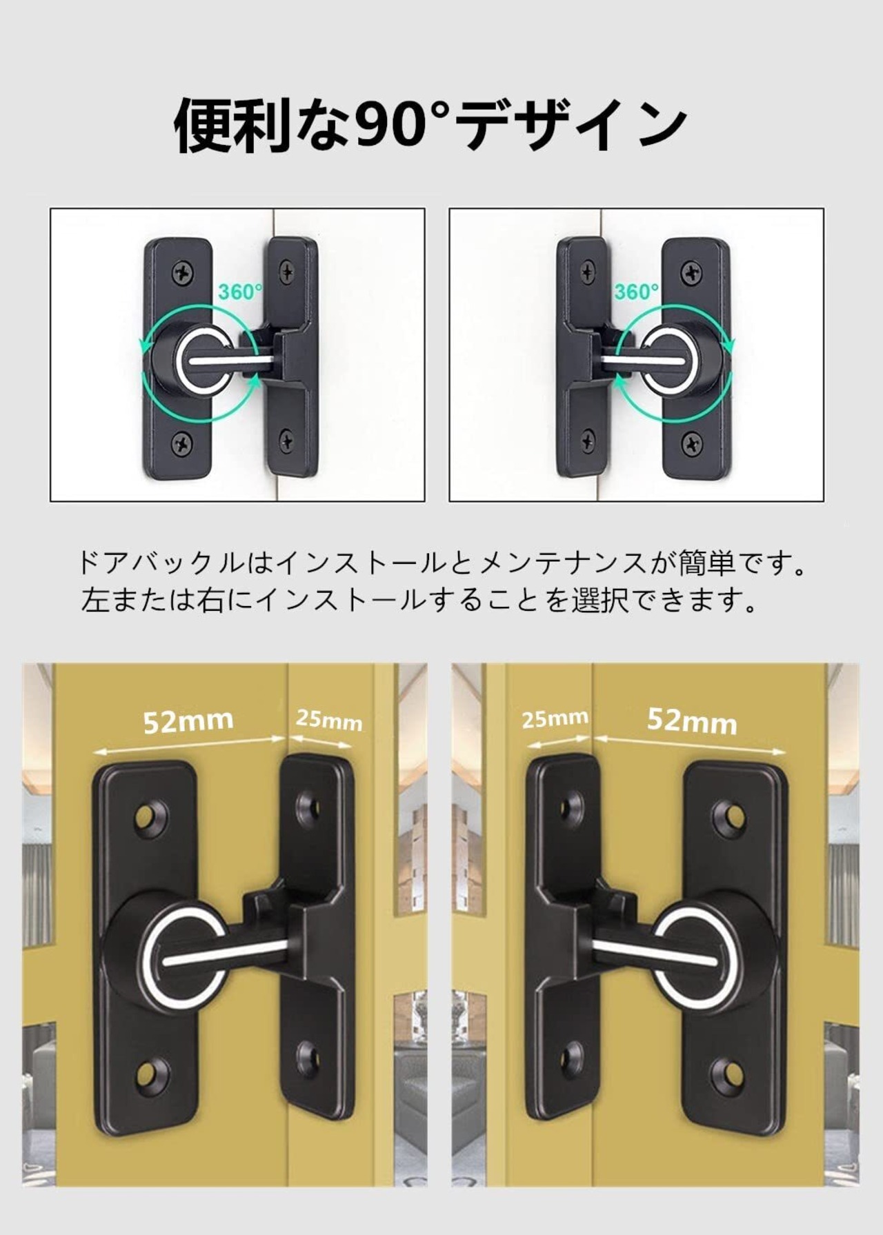 【取付けも簡単】取り付け用のネジが付属しているため、留め具をすぐに設置する事ができます。左または右にインストールすることを選択できます。特殊タイプで90度の角度で取り付けられるため、ドアや窓の安全を確保するために使用できます。