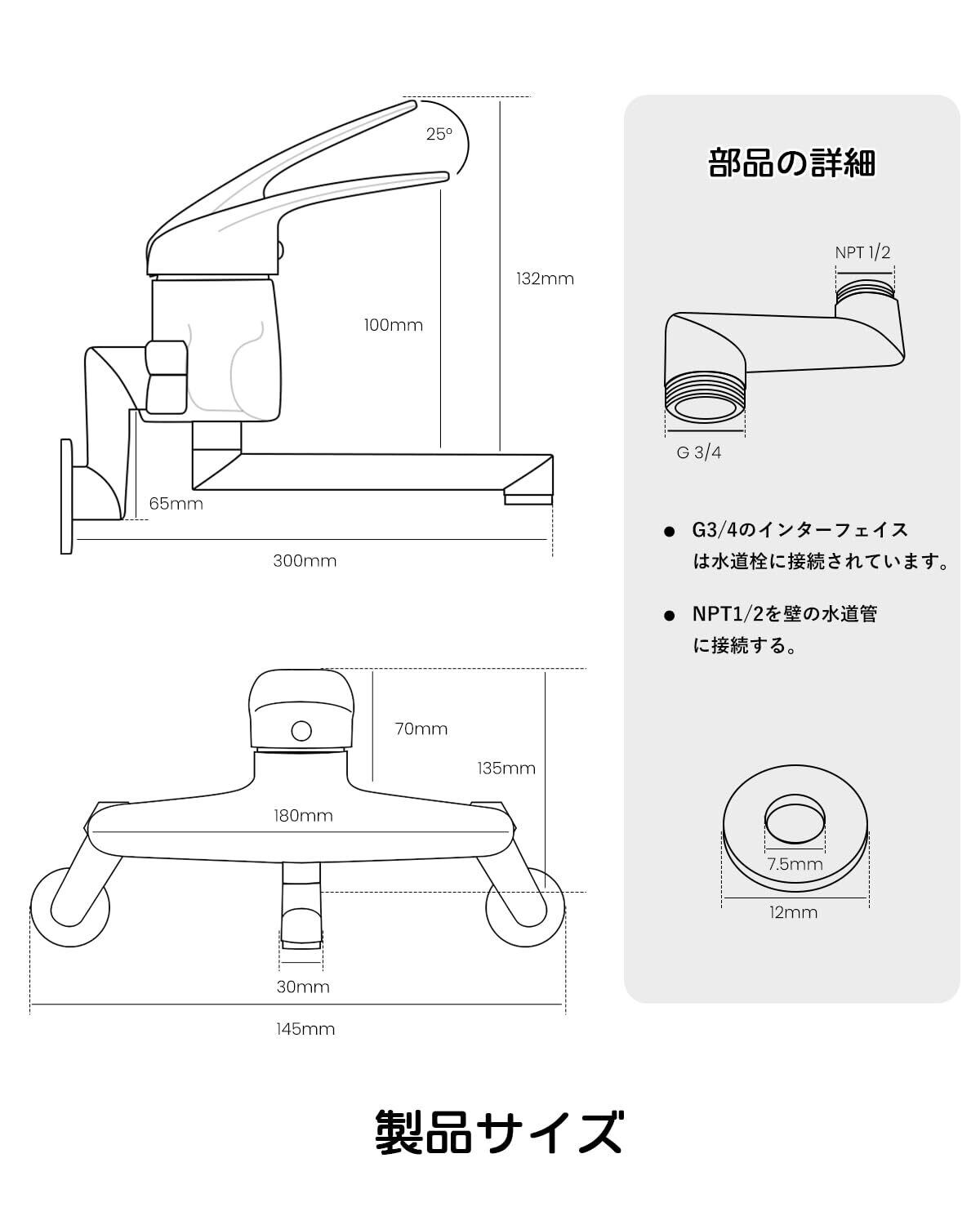 【DIY簡単 工事費8,000円節約】 DAYONE壁付キッチン水栓日本標準G1/2''インターフェース対応!専用防水テープ、スパナ、日本語説明書付き。。初心者でも20分で壁付 蛇口 の設置が完了。水道工事のプロ手配不要で初期費用大幅削減。
