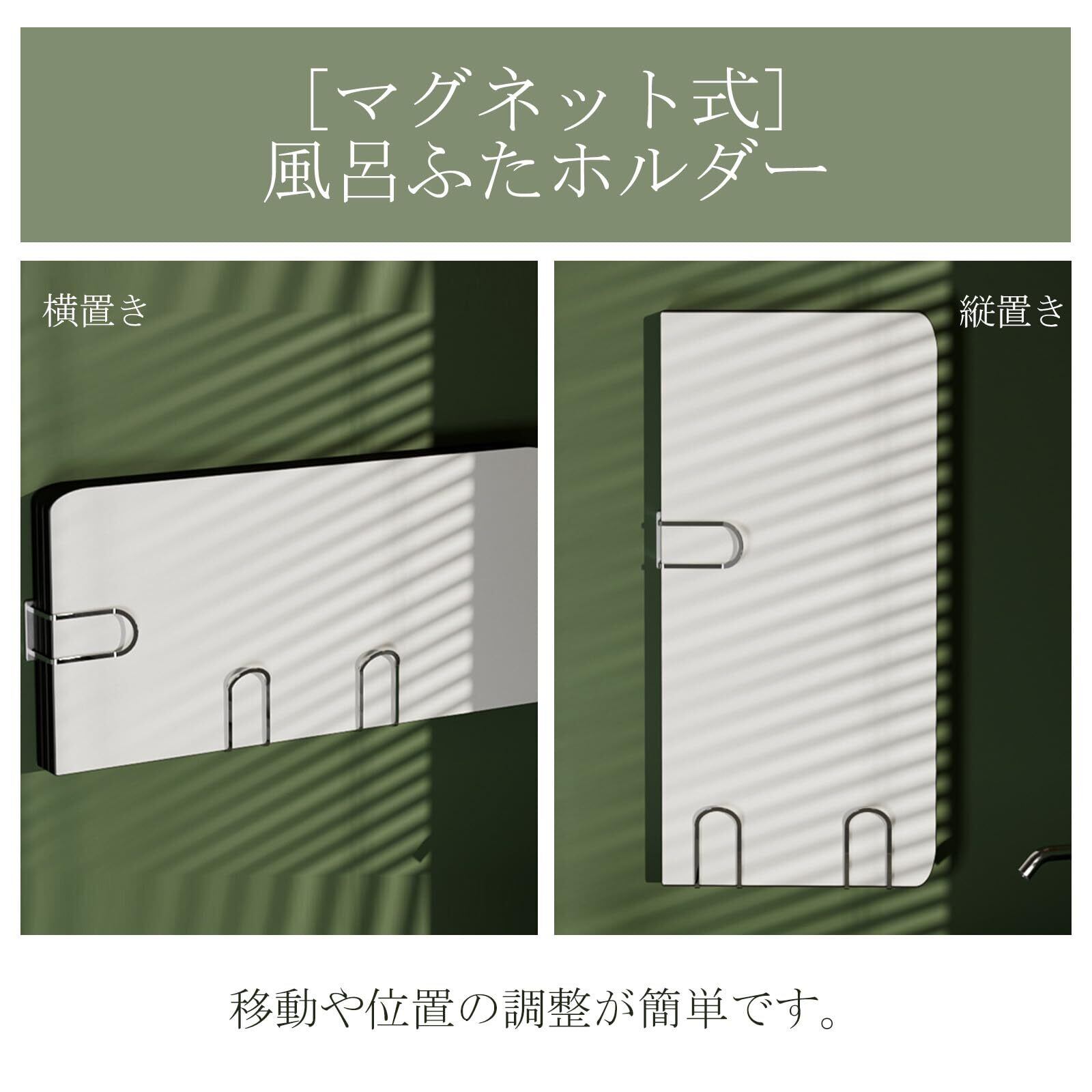 この風呂ふたホルダーは、マグネット式で簡単に設置でき、縦置きや横置きを自由に選べます。18-8ステンレス製で錆びにくく、風通しの良い設計により乾きやすいです。風呂ふたの定位置収納が可能で、浮かせて収納することもできます。穴あけ不要で壁面を傷つけず、スペースを有効活用できる優れものです。バスルームの空間をスマートに演出します。サイズは32×3×3cm、重量は約200gです。