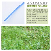【特徴】草刈り作業時の風切音低減したナイロンコードです。スパイラル形状で風切り騒音が30%も低減され、住宅街等での使用にお勧めです。高品質な共重合ナイロンを使用し、丸型の耐久性と四角型の切れ味のハイブリッドで切れ味に優れます。さらに硬いものに当たっても破損の心配がないので、コンクリートやフェンスなどの障害物のある周辺での作業も安心です。コードの先端で効率良く、草刈りが出来ます。春の軟らかい草~初秋の草にもお使い頂けます。20㏄~25㏄の刈払機にオススメです。