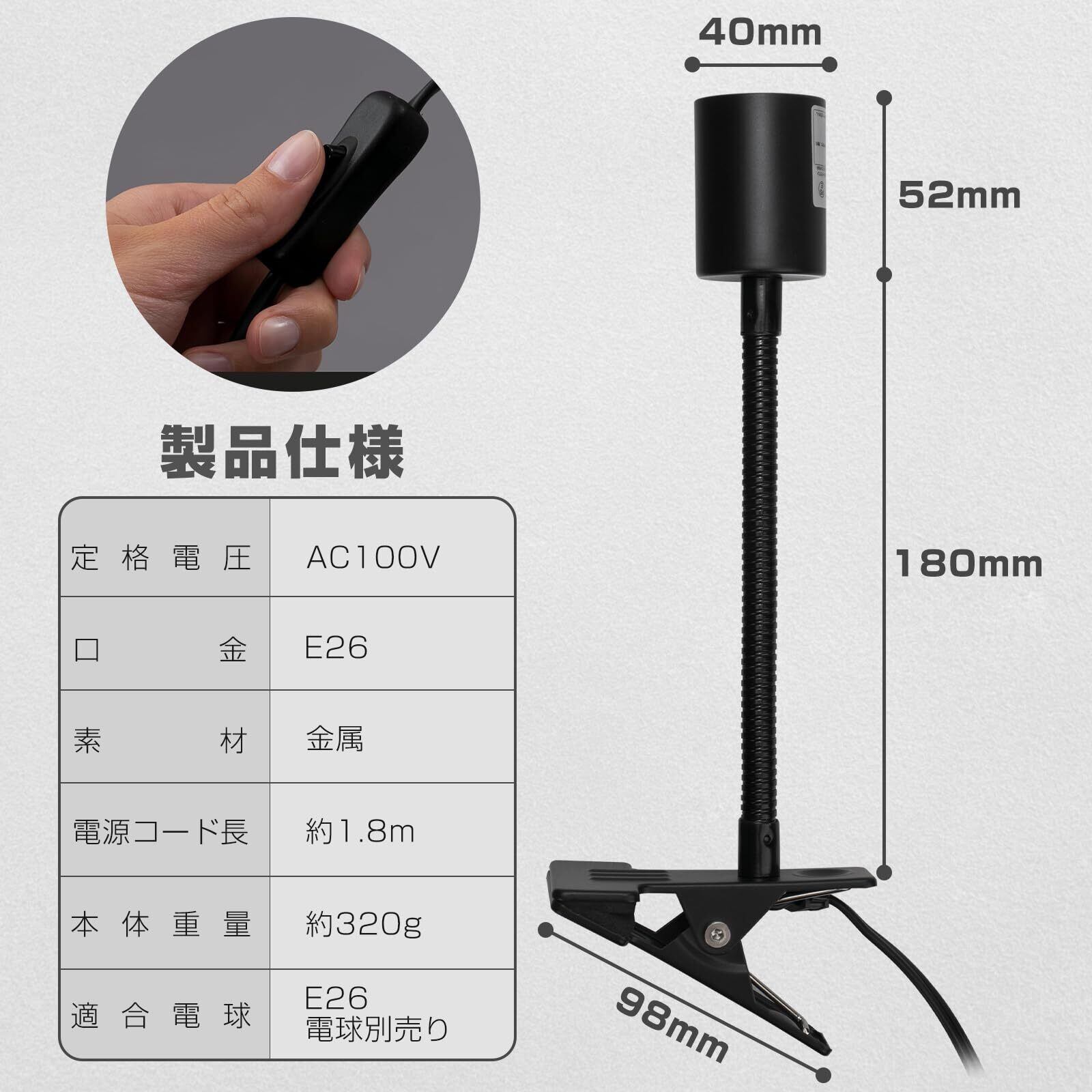 【E26電球対応&便利なスイッチ機能】一般的な家庭用電球から植物育成ライトまで、幅広いE26規格の電球に対応したクリップ式ソケットです。観葉植物の育成や作業用照明など、さまざまな用途で活躍し、ライフスタイルに合わせて柔軟にご使用いただけます。さらに、コンセントの抜き差しをせずに操作できるオン/オフスイッチを搭載しており、デスク周りや手の届きにくい場所でも快適にライトをコントロールできます。