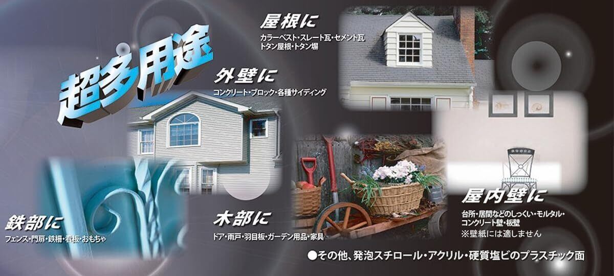 ●用途:フェンス・門扉・鉄作・看板・おもちゃなどの鉄部・鉄製品。カラーベスト・スレート瓦・セメント瓦・トタン屋根・トタンベイ。コンクリート・ブロック・各種サイディングなどの外壁やへい。ドア・雨戸・羽根板・板べい・ガーデン用品などの屋内外の木部。家具・木工品などの木製品。台所・居間などのしっくい・モルタル・コンクリート壁・板壁。発泡スチロール・アクリル・硬塩化ビのプラスチック面