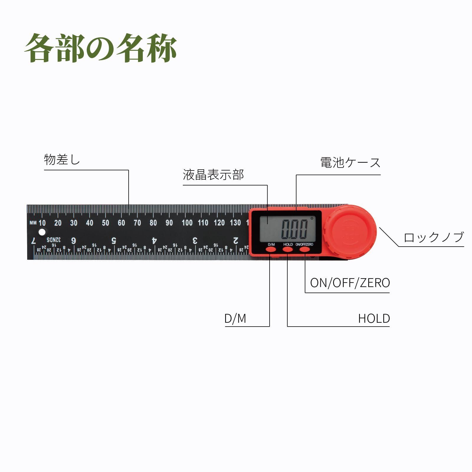 [3種計測] 本製品は、外角測定機能、内角測定機能、長さ測定機能を備えたデジタル角度ゲージです。外角/内角/長さを測定できます。[測定範囲] 角度:0~360°、長さ:0~200mm、精度:0.01 mm。高精度で、毎日のご使用に最適な測定ツールになります。スライド部の動きは軽いです。回してロックすれば、物差しが任意の角度に固定できます。測量対象の長さと角度を同時に測定できます。