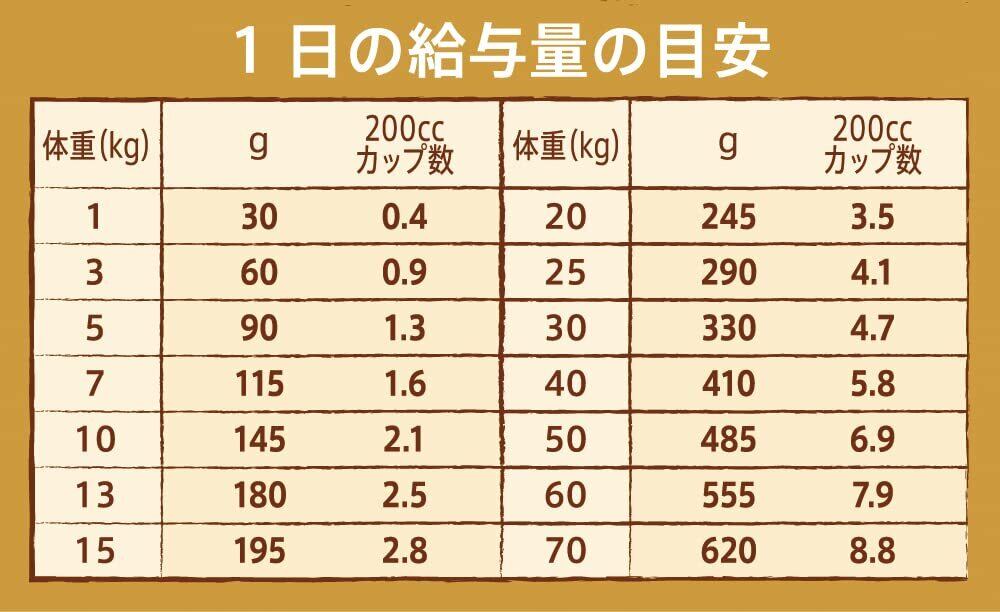 愛犬の体型や年齢などの1日に必要なカロリーに合わせ、適切な量を与えて下さい。