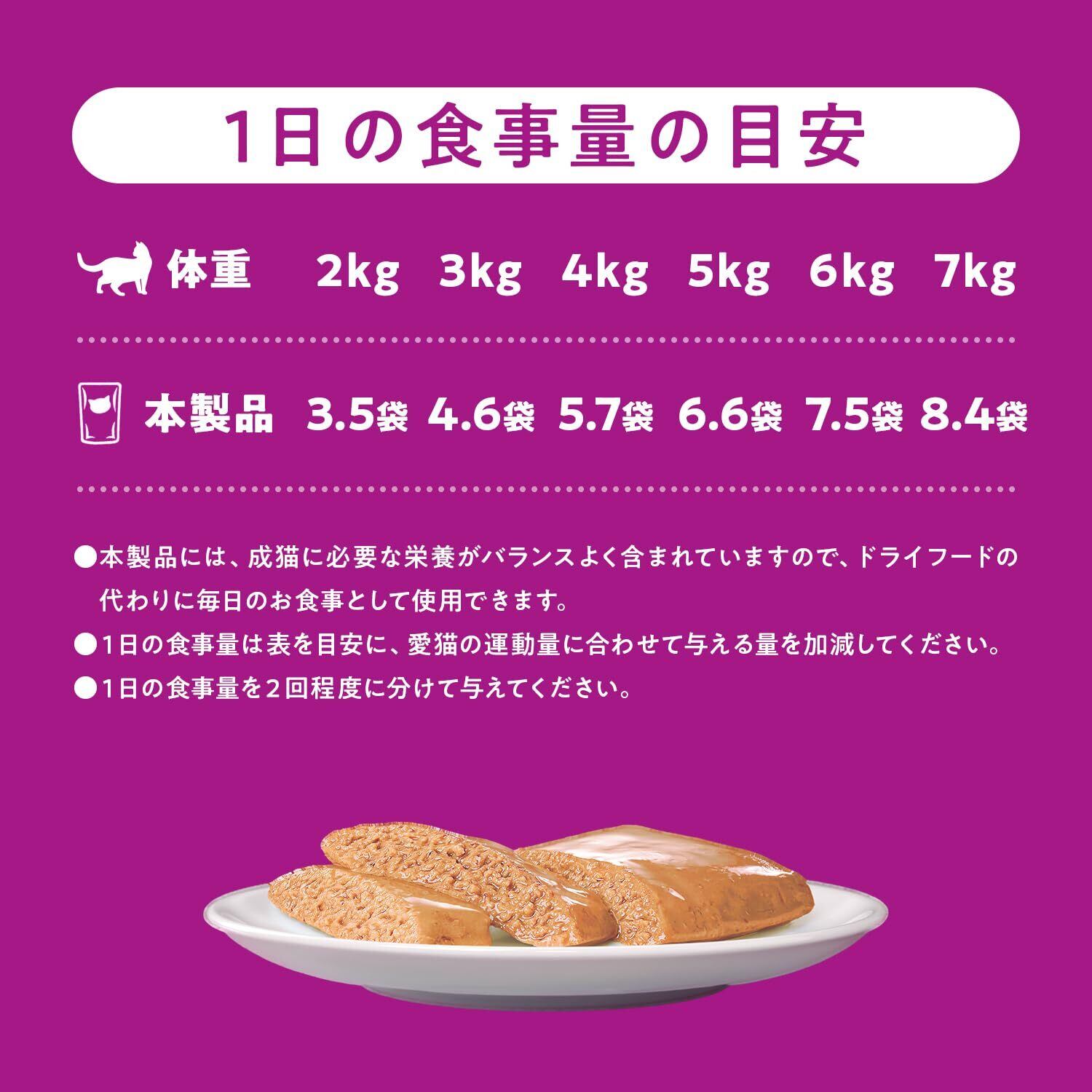 体重2kg:3.5袋、3kg:4.6袋、4kg:5.7袋、5kg:6.6袋、6kg:7.5袋、7kg:8.4袋 本製品には、成猫に必要な栄養がバランスよく含まれていますので、ドライフードの代わりに毎日のお食事として使用できます。1日の食事量は表を目安に、愛猫の運動量に合わせて与える量を加減してください。1日の食事量を2回程度に分けて与えてください。常に清潔で新鮮な飲み水をご用意ください。本製品を初めて与えるときは、今までの食事に少量混ぜ、1週間程度で徐々に増量しながら切り替えてください。