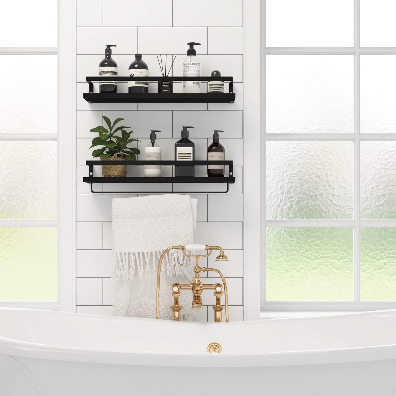 【落下防止設計・タオル掛け付き】ウォールシェルフの金属フレームは、三面ガードレールデザインで、物の落下を防ぎます。パウダーコーティングされた表面は、外観を向上させ、防錆を提供し、耐久性と視覚的に魅力的です。付属のタオル掛けは、棚板の下だけでなく、壁に取り付けてタオルを掛けることもできます。