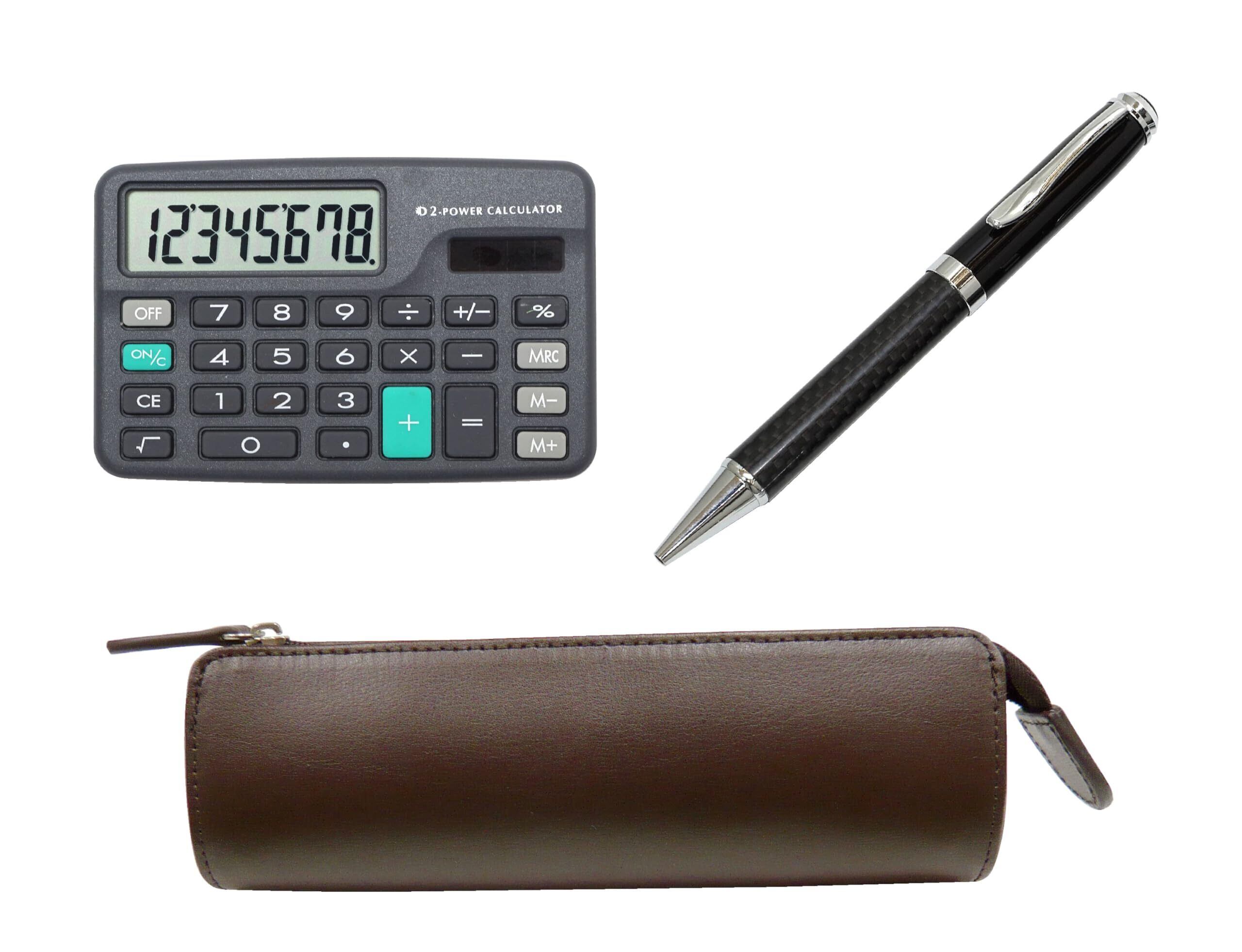 電卓とリサイクルレザーのペンケースとカーボンファイバーと真鍮を使用したボールペンのセット。※ペンケースの中に電卓を入れる事は出来ません。