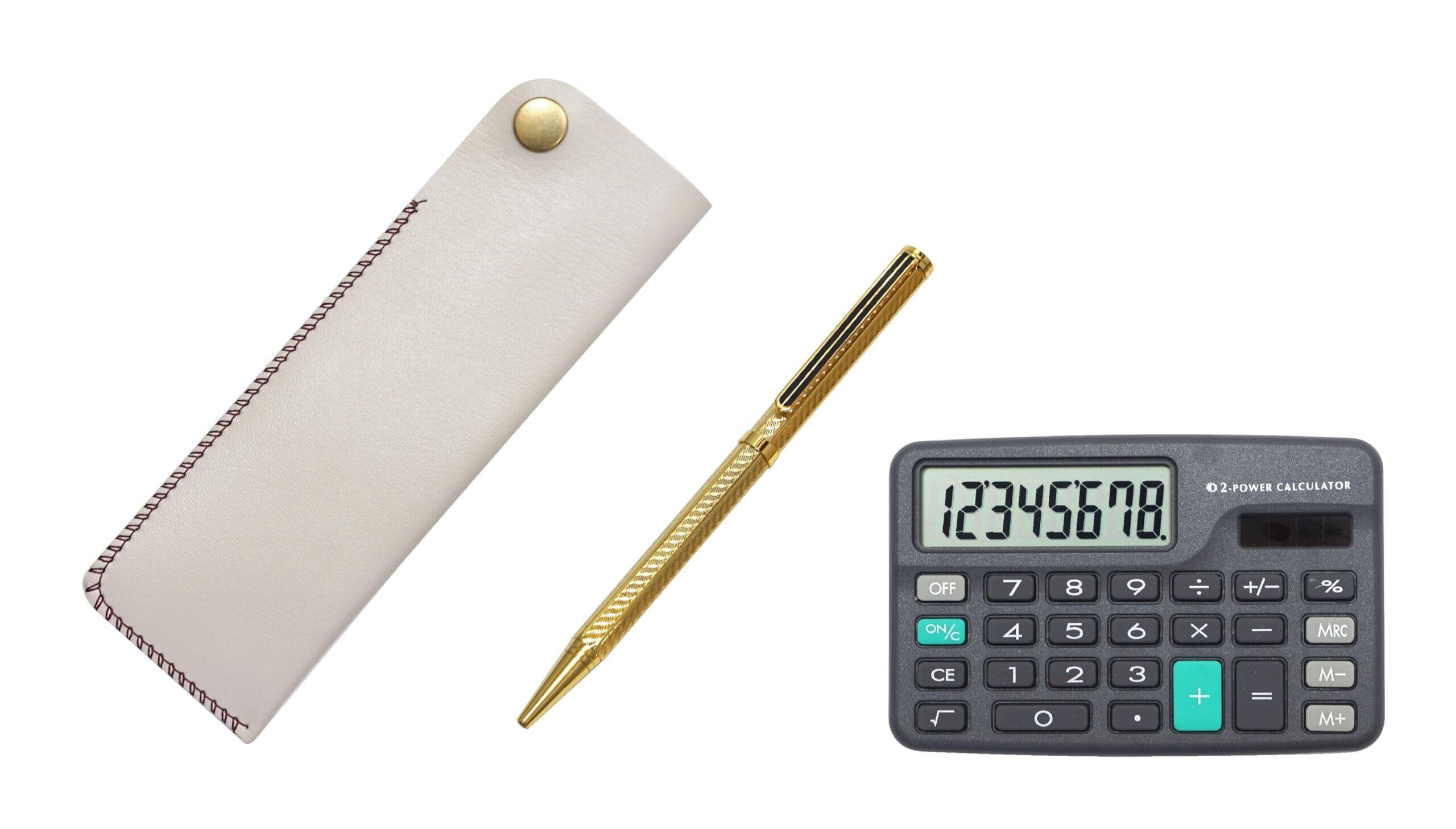 電卓とホック式ペンケースと金軸ボールペンのセット。※ペンケースの中に電卓を入れる事は出来ません。