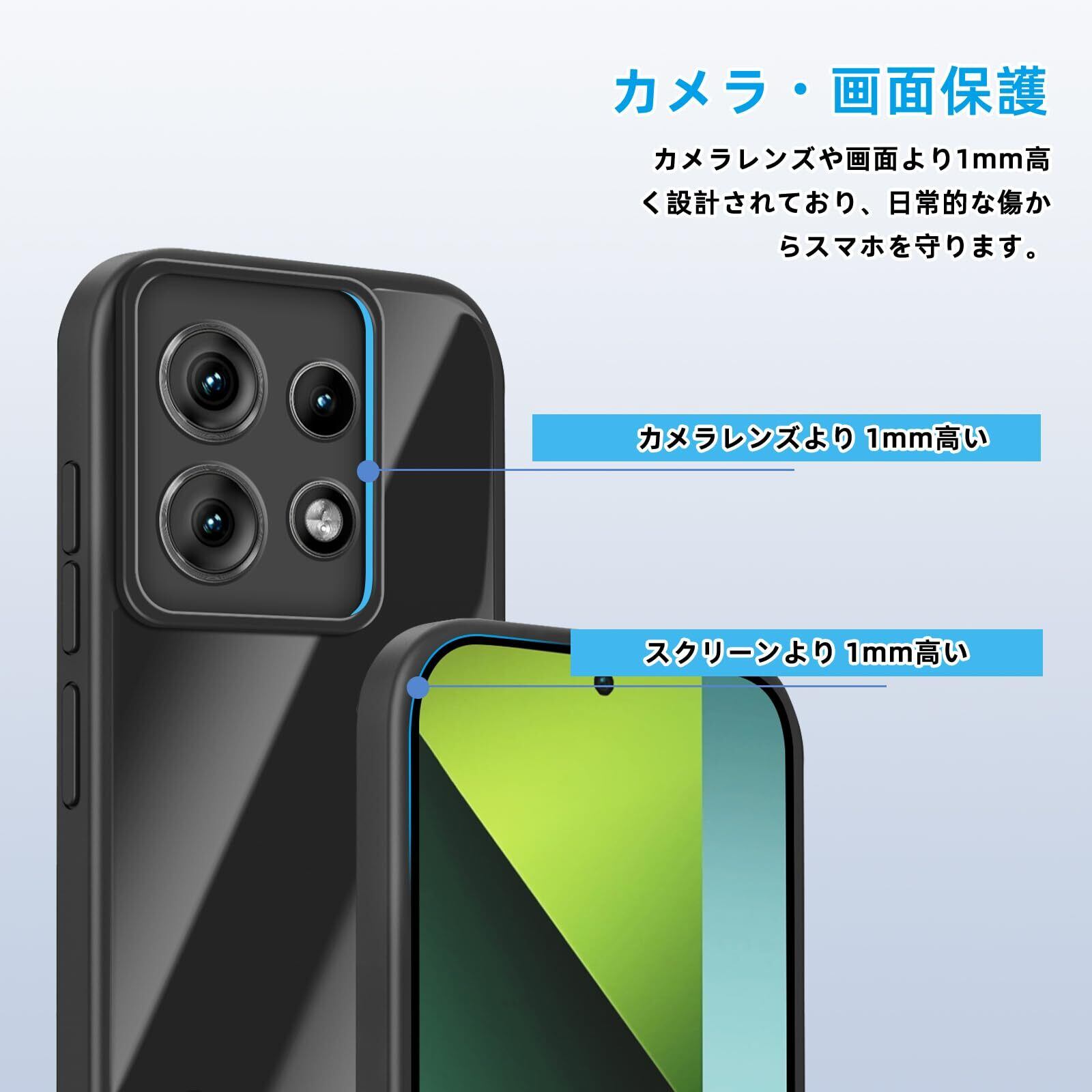 【スクリーンとカメラの保護】カメラ全体を傷から完全に保護するフルカバーカメラデザインが特徴です。保護ケースは装着時にカメラより1mm高く、傷を防ぎます。ケースの端はわずかに盛り上がっており、平らな面でカメラやスクリーンが擦れたり傷ついたりするのを防ぎます。柔軟な TPU と衝撃吸収保護コーナーを組み合わせて、落下やその他の衝撃から携帯電話を確実に保護します。