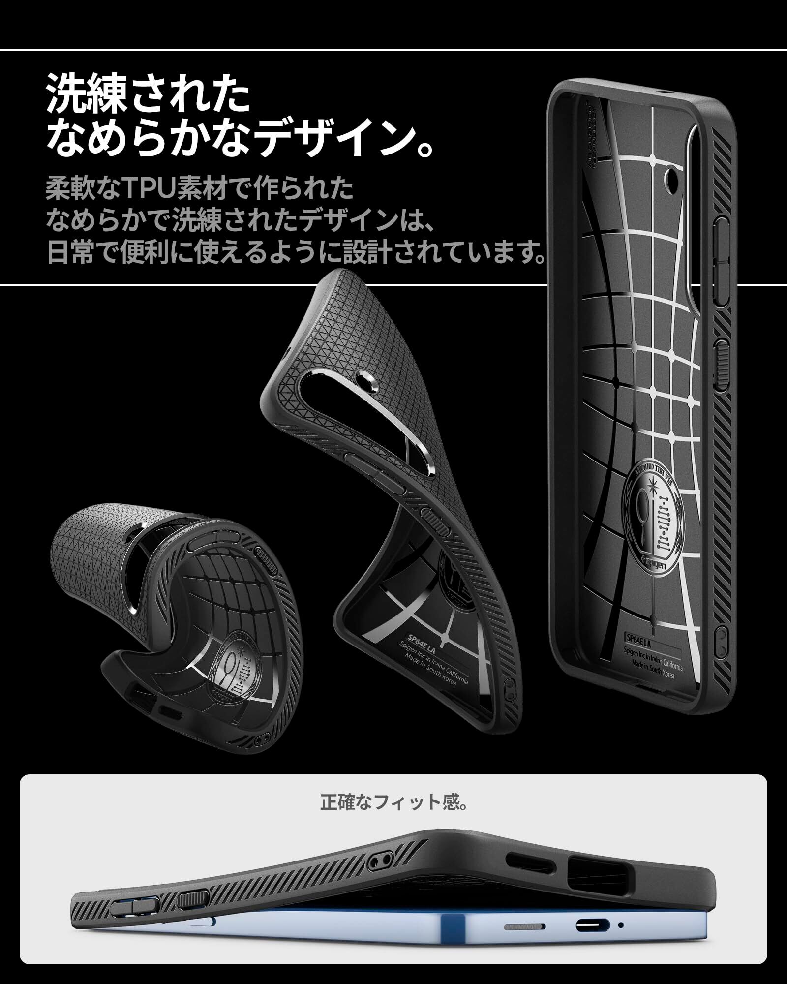 【高耐久のマット素材】マットな仕上げとジオメトリックなパターンが魅力的なリキッド・エア。装脱着が簡単になる柔らかいTPU(熱可塑性ポリウレタン)素材に衝撃を吸収するエアクッションを適用し、極めた保護力でデバイスを守ります