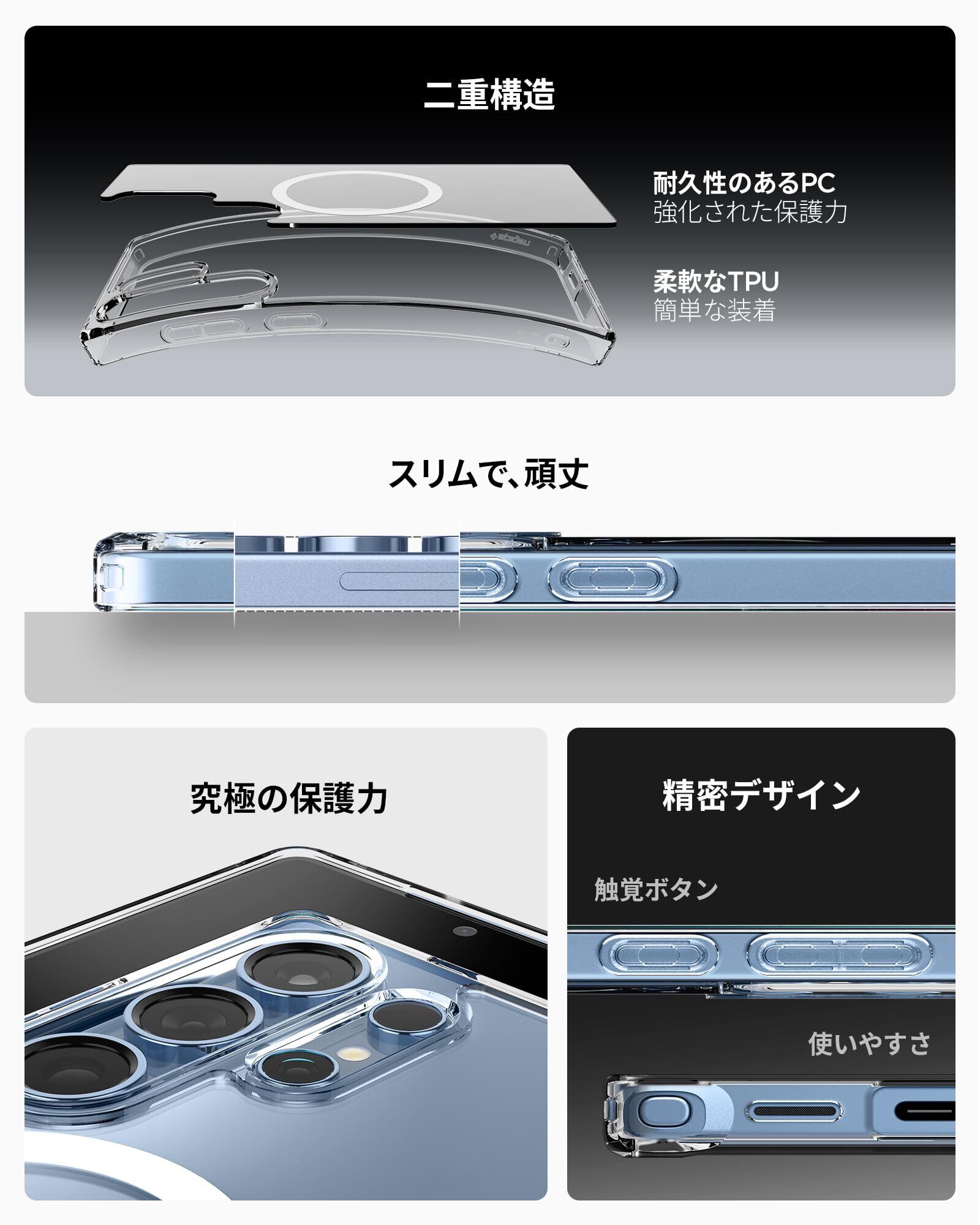 【高耐久のクリア素材】装脱着が簡単になる柔らかいTPU(熱可塑性ポリウレタン)に丈夫なPC(ポリカーボネート)をハイブリッドさせた2重構造でデバイスを守ります。背面のPCにはUVコーティング、側面のTPUには青いレジンを活用した新素材「デュラクリア」を使い、黄変を最小限に抑制しました。