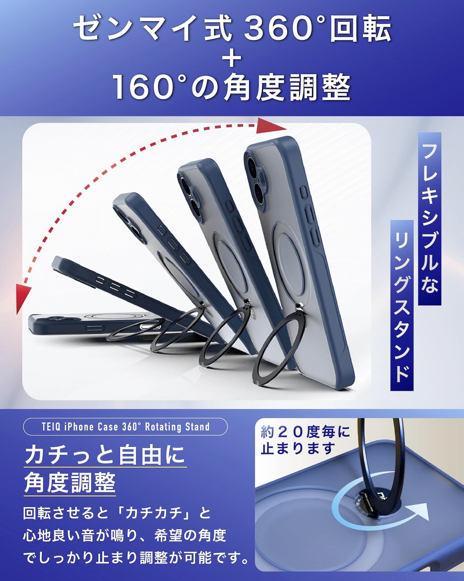 【 360°回転リングスタンドケース ・縦横自在の配置が可能 】 通常の固定式のスタンドケースとは異なり、iPhone 対応のこのスタンドケースは360度の回転に対応しています。Web会議や友達とのビデオ通話時には縦置き、映画や動画の視聴時には横置きにと、シーンに合わせて立てることが可能です。