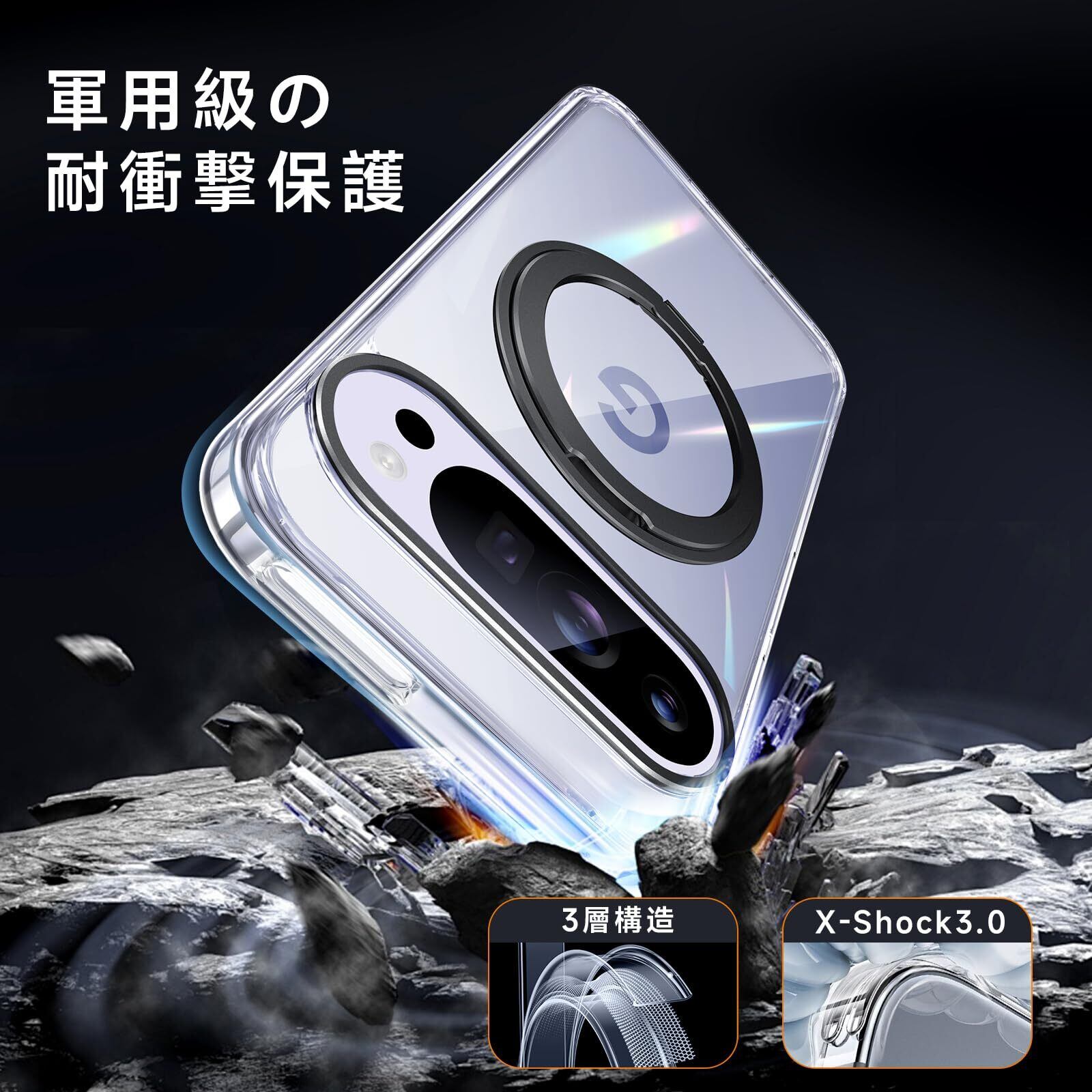 【米軍MIL規格準拠・高耐衝撃性能】米国国防総省の耐衝撃試験「MIL-STD-810G」に準拠し、耐衝撃性能が従来比20倍アップ!スマホの落下時に特に衝撃を受けやすい四隅には、衝撃を分散するクッション構造を採用。また、ケースの側面には柔軟性の高いTPU素材を使用し、耐衝撃性を強化。Google Pixel 9 / 9 Proをしっかりと守ります。