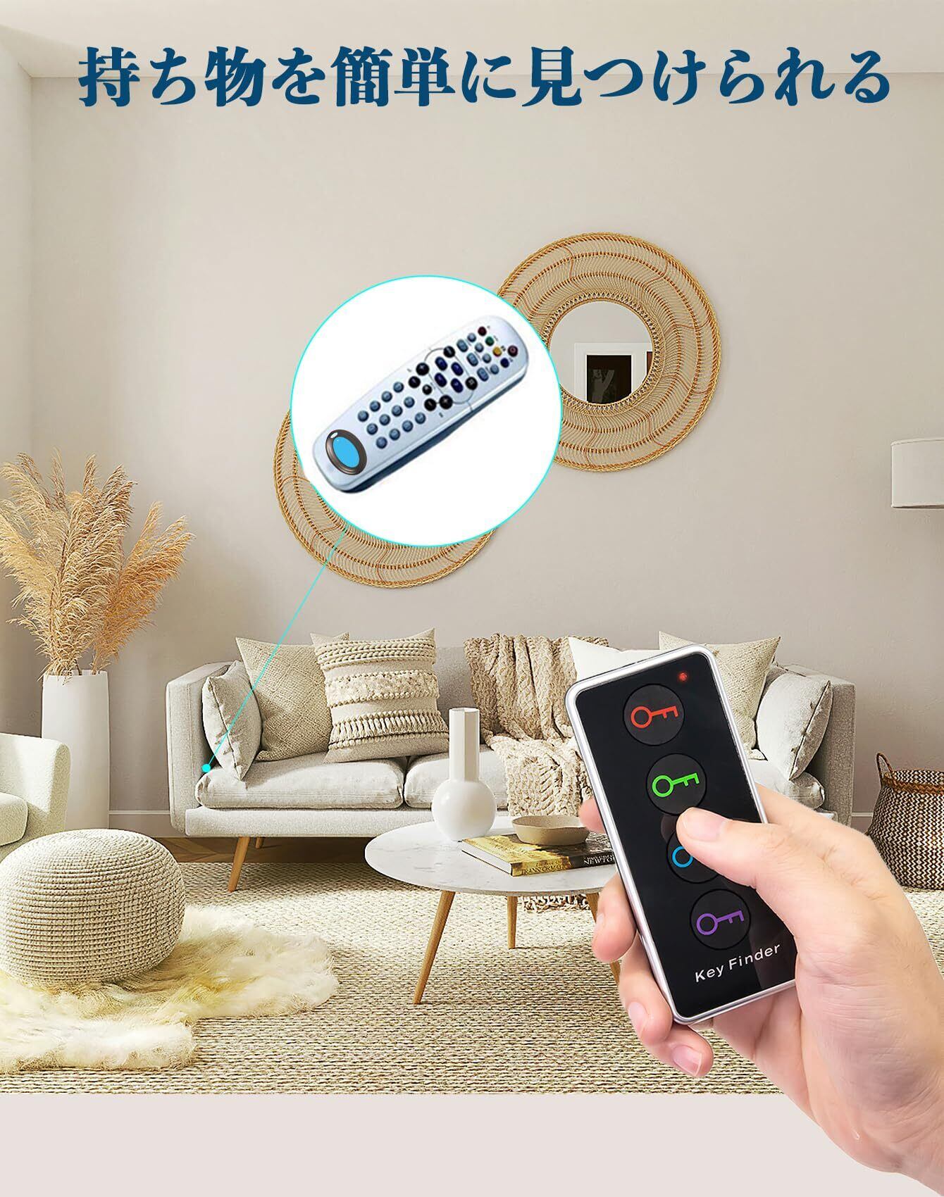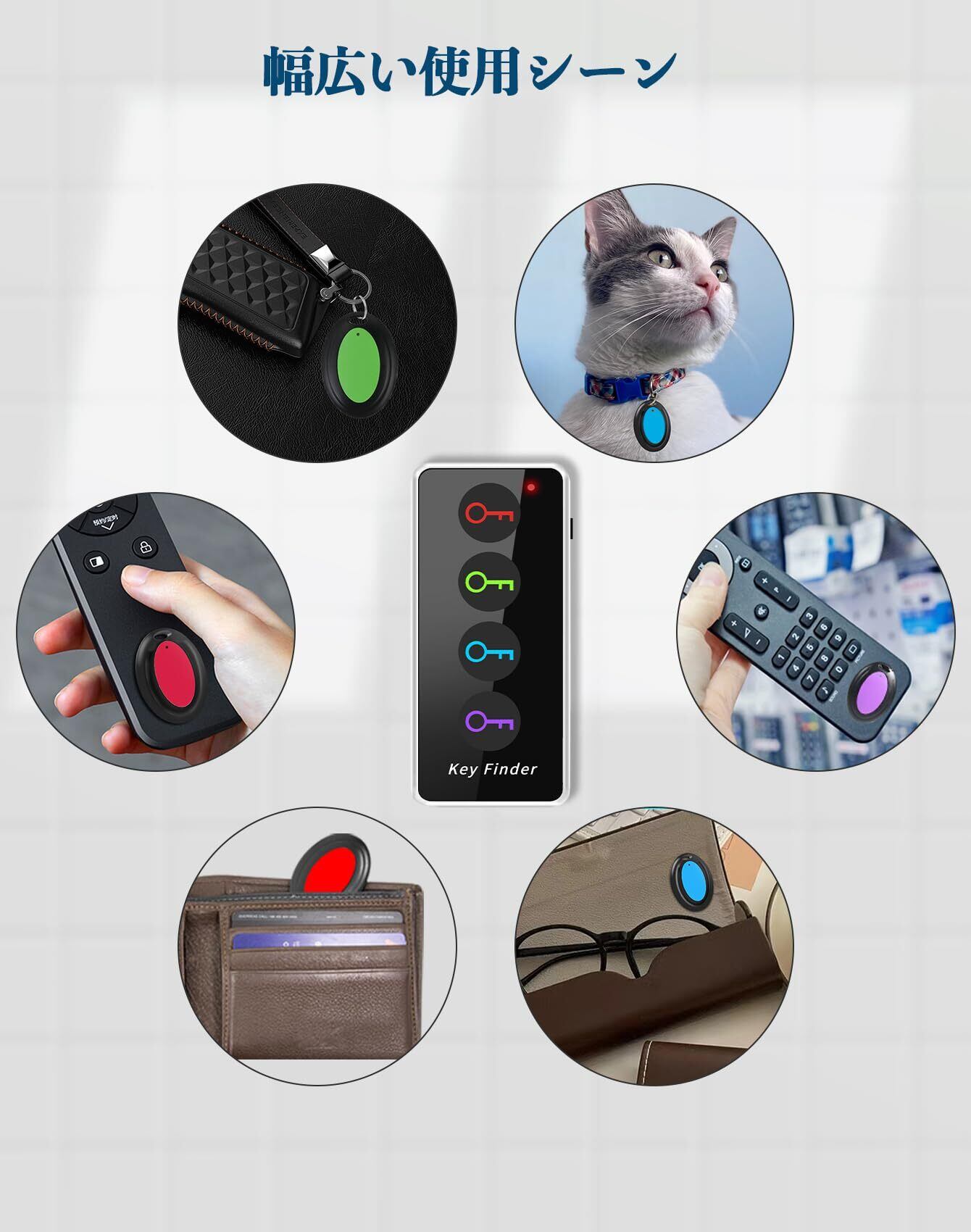 【4つのレシーバー+1つのリモコン】カラー別のレシーバー4個付きで、鍵・財布・リモコン・荷物・ペットの首輪などの紛失防止に役立ちます。キーホルダーと面ファスナーシールの2通りの取り付け方が可能で、ラベルシールと収納ベースも付属しています。