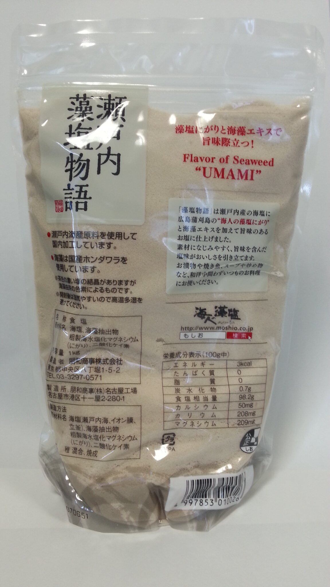 塩田による製塩が始まる以前、縄文時代より平安時代までの間に日本各地で行われていた"藻塩焼き"による製塩法の味わいを基にし、岡山県産の塩に海藻エキスと藻塩にがりで仕上げた混合法の藻塩です。“藻塩"とは、万葉集や百人一首にも登場する、古代人が食した日本で一番歴史のある塩です。瀬戸内海の海水で出来た塩をベースに、同じく瀬戸内産の"海藻エキス"、広島県の"海人の藻塩"製造時に採取される藻塩にがりを加えて、海藻の"旨み"たっぷりに仕上げた「瀬戸内の海の恵み」の結晶です。海藻成分で薄茶色が特長です。サラサラとした性状は「振り塩」「つけ塩」といった調理のシーンにも非常に使い勝手よくできれおります。袋のままで使用し易いスタンドパックタイプ。開封口もファスナー付で、袋の開閉も自在です。