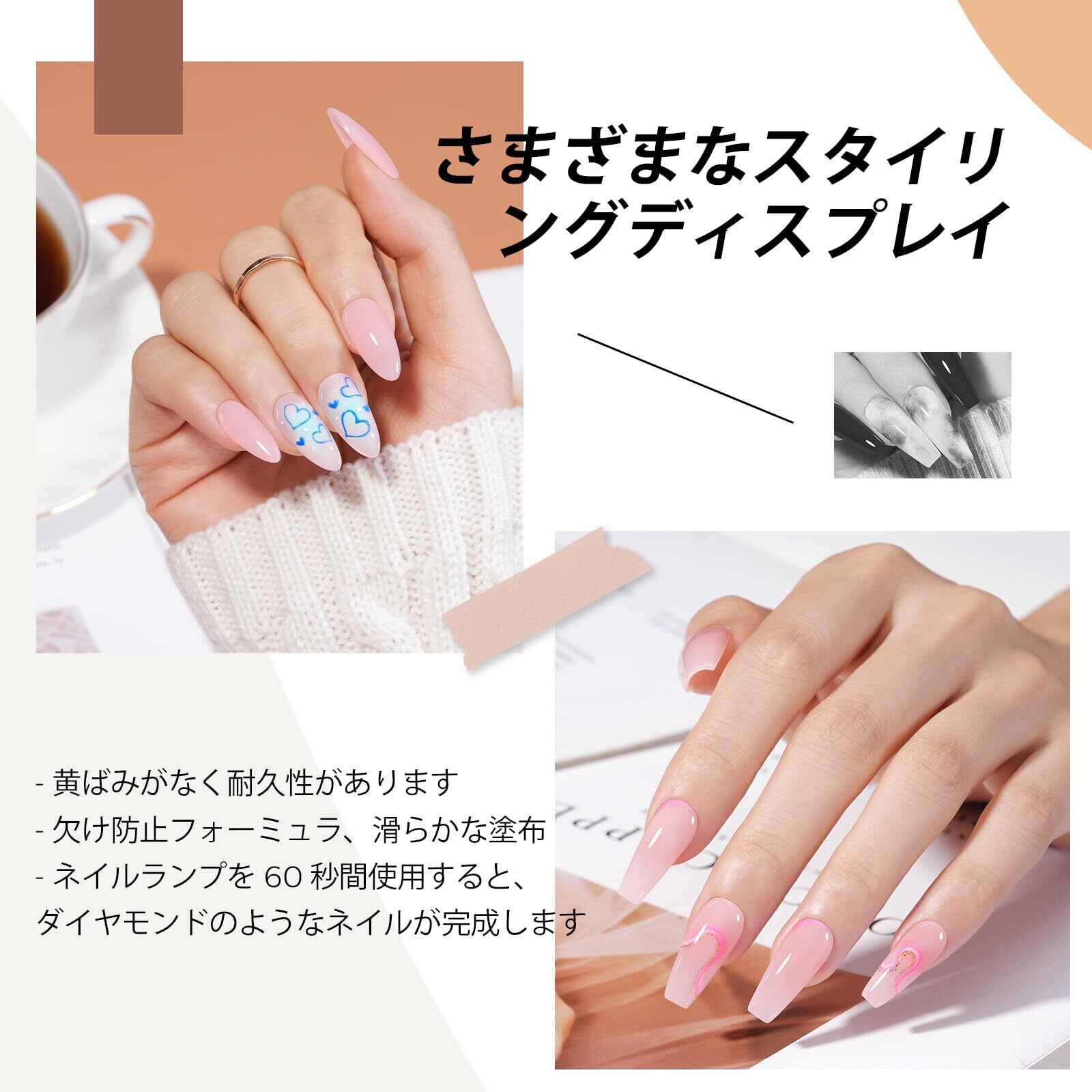 ゼリースタイルのジェルネイル: オパールゼリーな質感にこだわったネイルジェル、透明感たっぷり。さりげなく洗練された透明感のあるピンクスタイル。日常生活、仕事、デートに使えます。 フレンチネイルを作成するベースカラーとしても使用できます。単色として使用だけでなく、ブルーミング、ホログラム、押し花などのりやデザインにも適用。