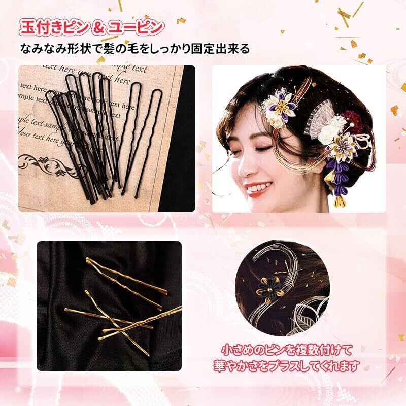 夜会巻き、アップヘア、サイドアップ、お団子、編み込みなど人気のまとめ髪の補助やアクセントにオススメです。大人の方は結婚式、パーティー、謝恩会、成人式、卒業式など華やかなお席の和装、振袖姿や浴衣のコーディネートにぴったりします。お正月、お祝い事、桃の節句、七五三、卒園式などにオススメです。