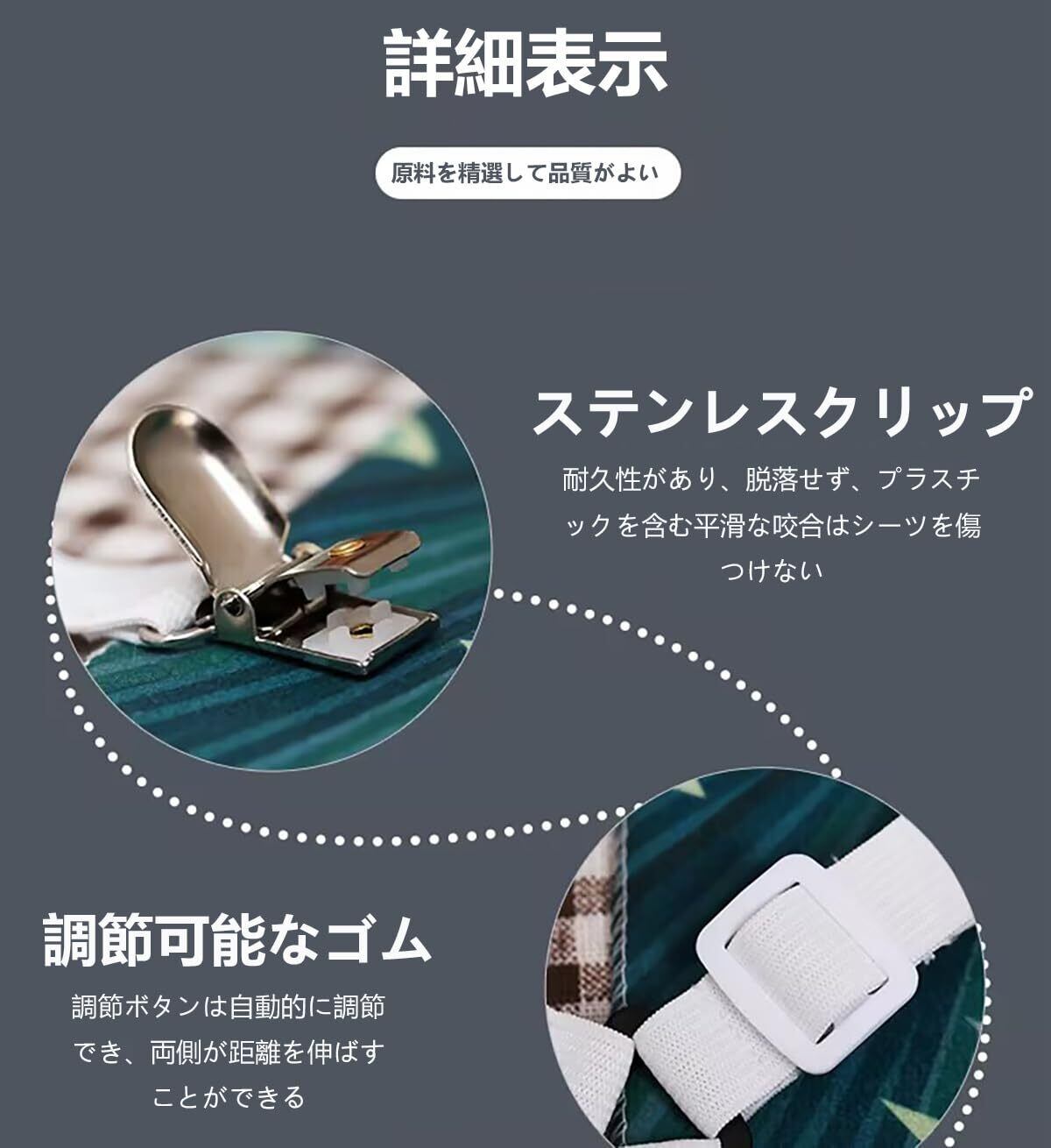 【伸縮可能】マジックテープ付きの布団ずれ落ちクリップは、伸縮性があり、長さを調整できます。シーツを固定することで、一晩中快適な寝心地を実現します。