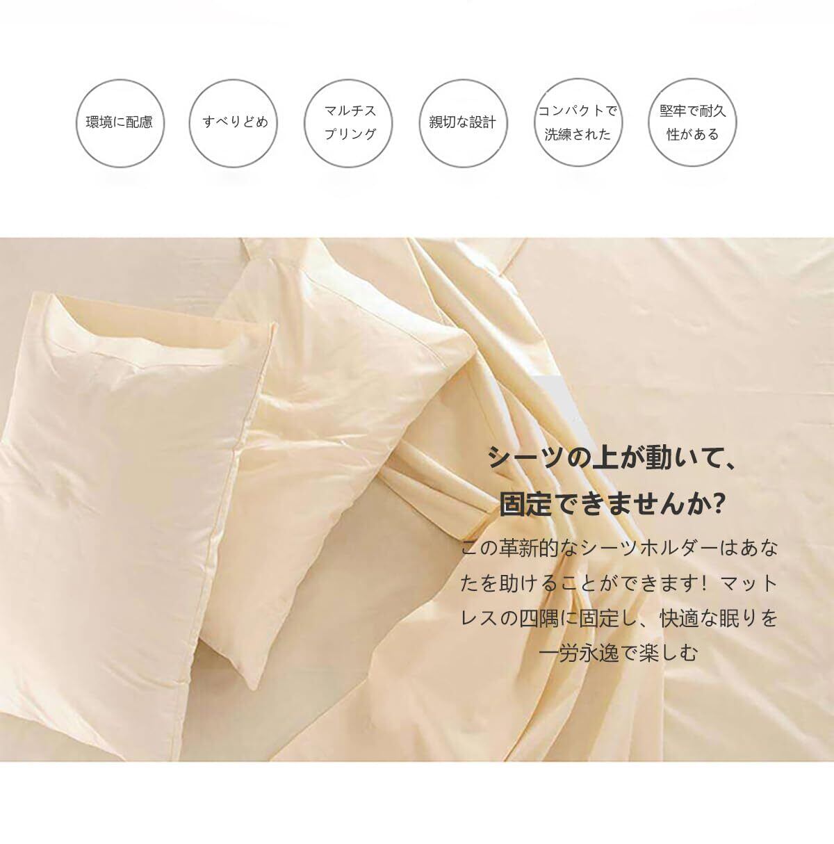 【ベッドシーツズレ防止】強力クリップを採用した安心設計の布団ずれ防止クリップは、ベッドシーツの四隅を裏側からしっかり固定し、ズレを防止します。プラスチック製の爪はシーツに傷をつけません。