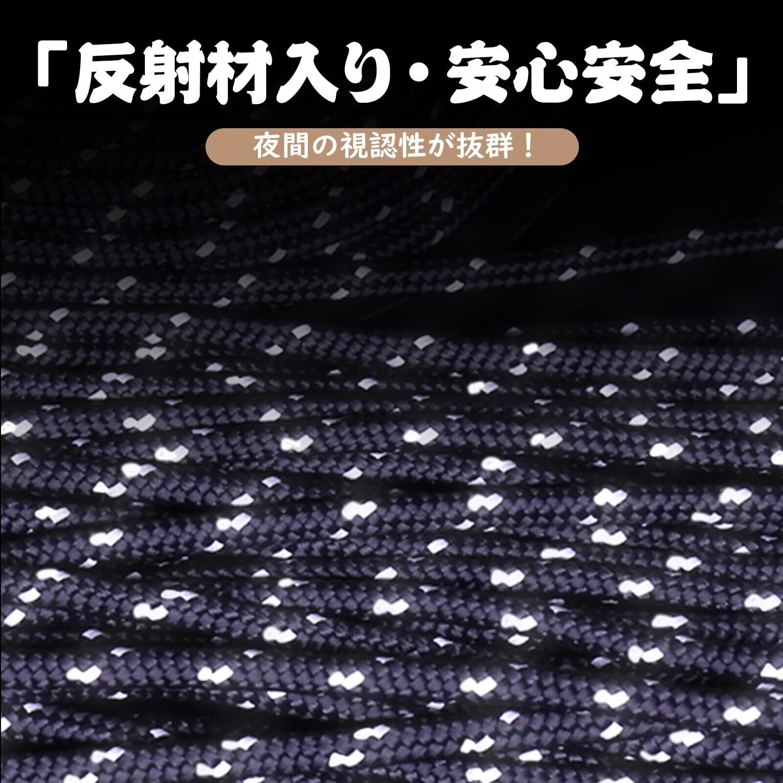【強い反射性】このロープは2本の反射材入りワイヤーが編み込まれています。わずかな光があれば視認性を高めます、夜でも足を引っ掛けることもご心配なく。