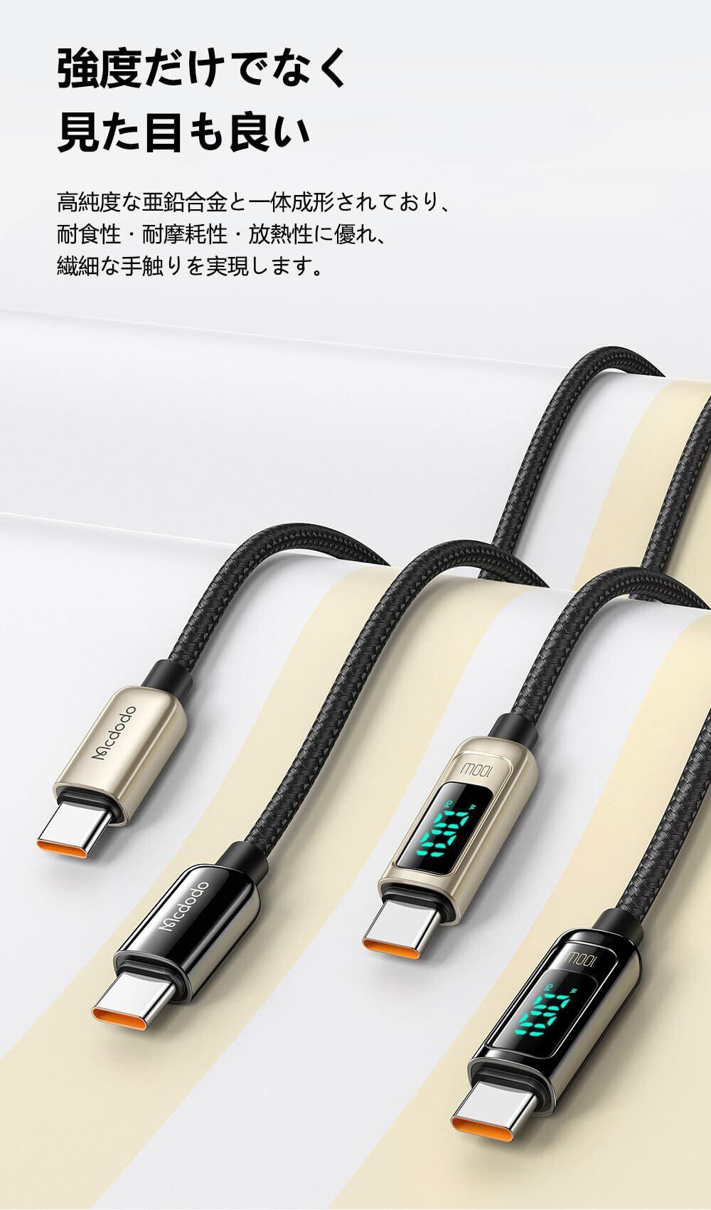 【E-markerチップ搭載】:E-markerスマートチップを内蔵しており、Mcdodo独自に開発したMSC充電技術を搭載し、電流に合った機器を自動判別し、電圧を合理的にコントロールできます。【出力スクリーン表示】:Mcdodo最新進化されたスマートチップは、リアルタイムに出力を表示し、接続機器の急速充電状態を分かりやすいになります。(※注意:一部旧モデルで最大入力電圧5V対応の場合、急速充電状態はPDロゴが表示されません)。