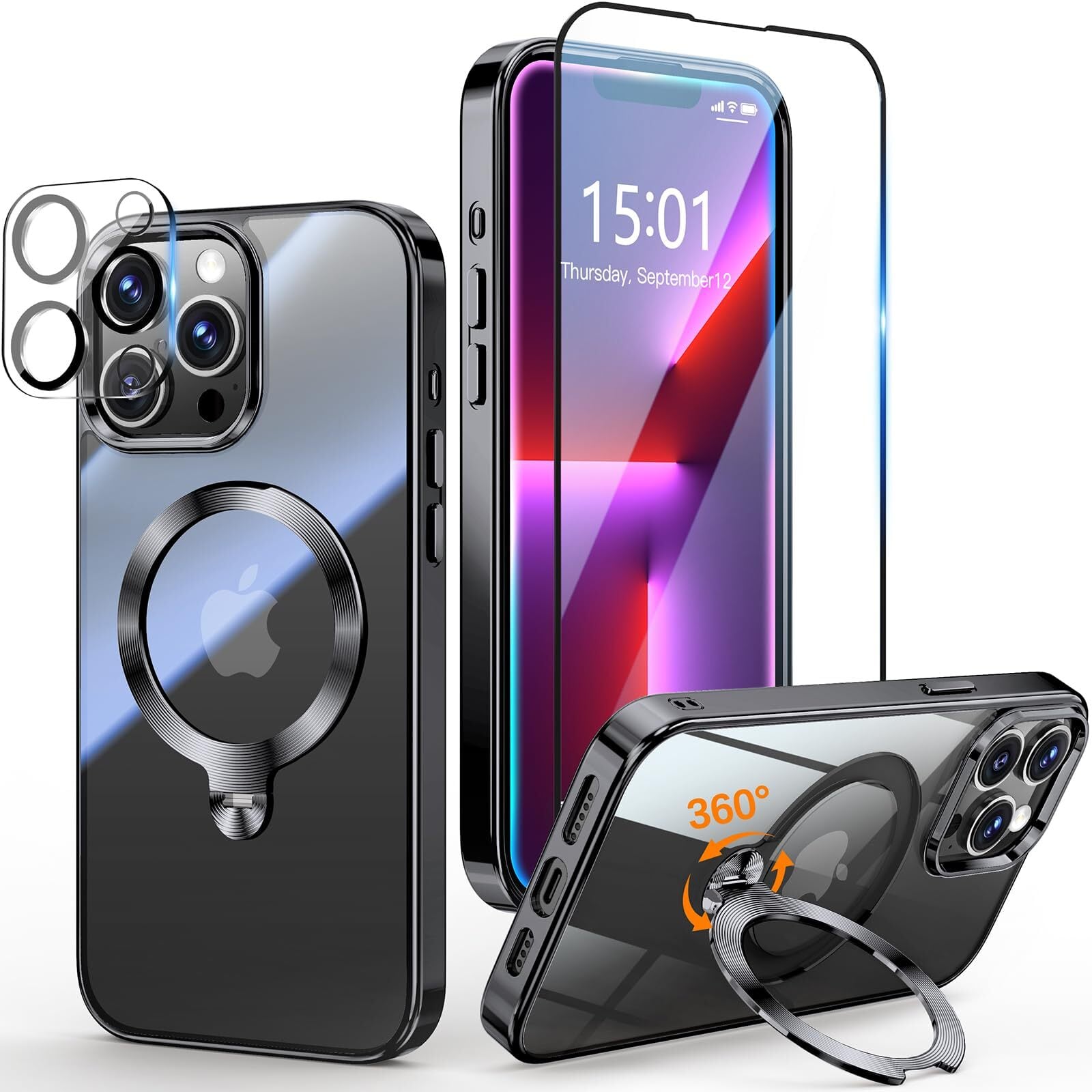 【新着商品】【三重保護セット!上品なメタリック光沢】OYR iPhone 13 Pro 用 クリア ケース Magsafe 対応[360°回転CD スタンド・10 万回開閉テスト][メッキバンパー・iPhone専属色][カメラ保護とガラスフィルム付き]ストラップホール付き マグセーフ アイホン13プロケース マホケース13 Pro 人気 米軍MIL規格取得・耐衝撃(6.1インチ・ブラック)