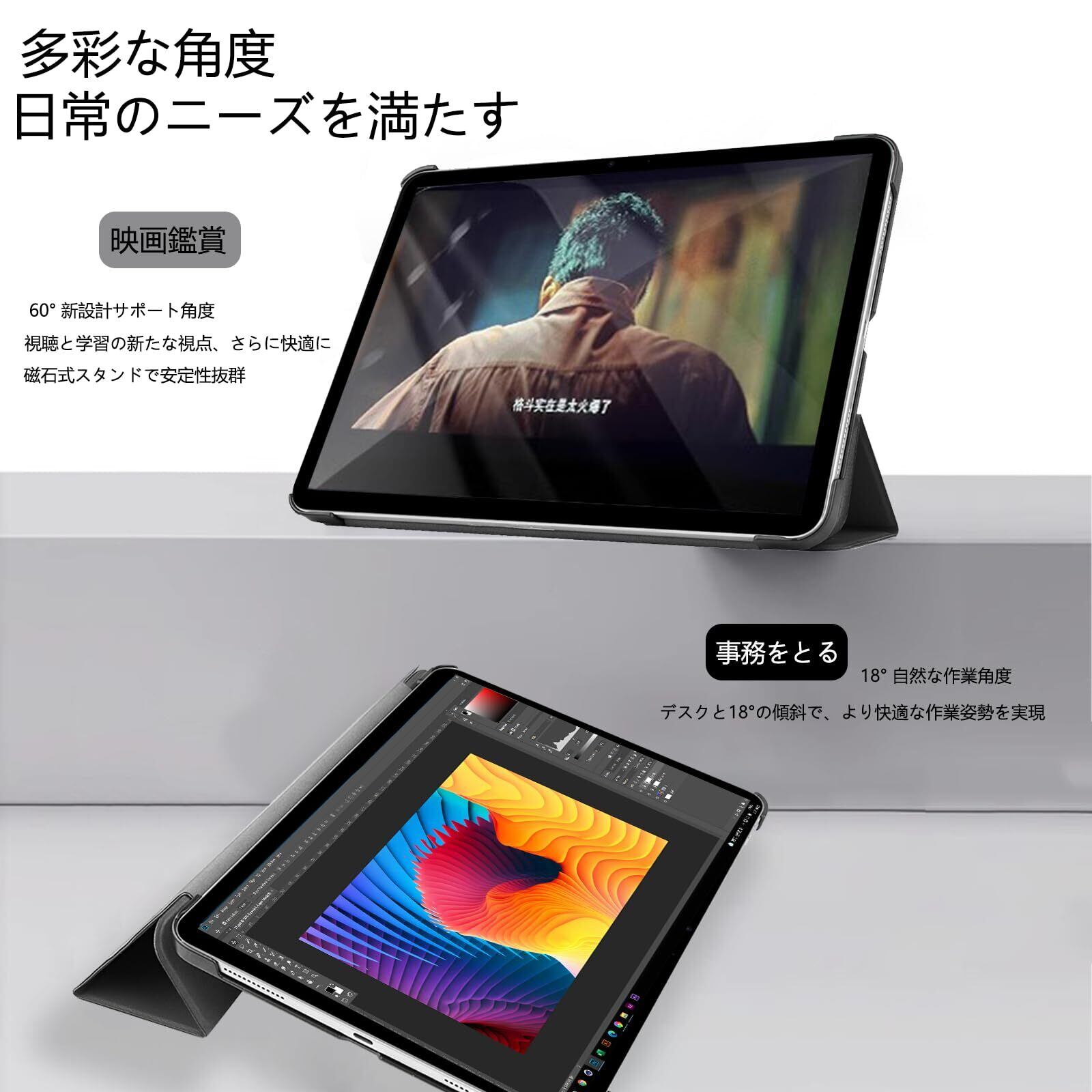 【自動スリープ/ウェイク機能】内蔵磁気センサーがカバーの開閉を感知。開封時に自動で画面が点灯、閉じると即座にスリープモードに移行する省電力設計。カバーの角度調節不要でワンタッチで操作可能なため。