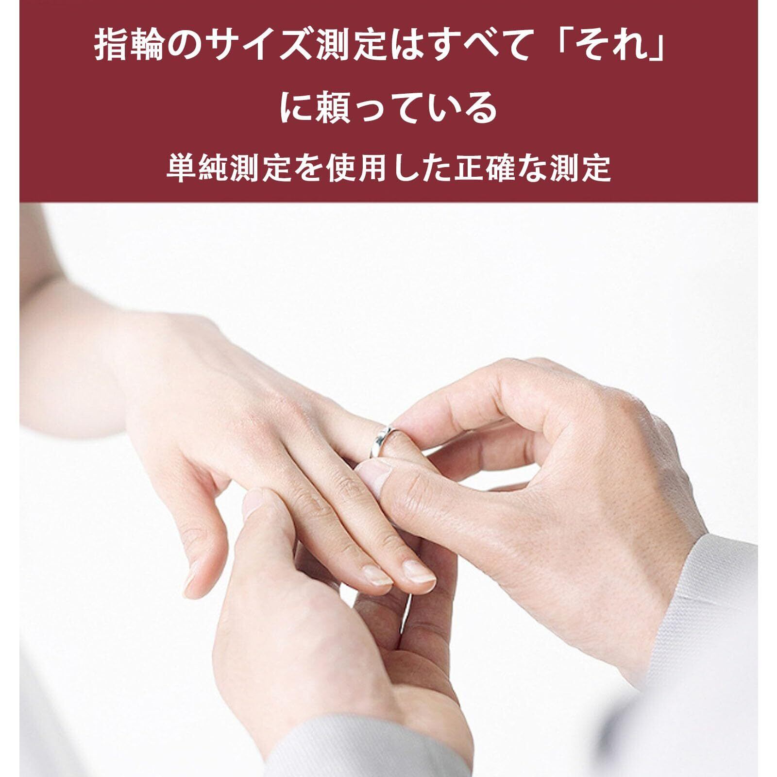 【測定時のご注意】リングゲージ 自体の重さで 指 と ゲージ の間に隙間ができ、実際の サイズ より緩くなる場合があります。測定時には、ワイヤーから外すか手のひらに接地させてお測り下さい。指輪を着ける指の腹より第二関節が太い方は、関節が無理なく通るサイズが適正なサイズとなります。