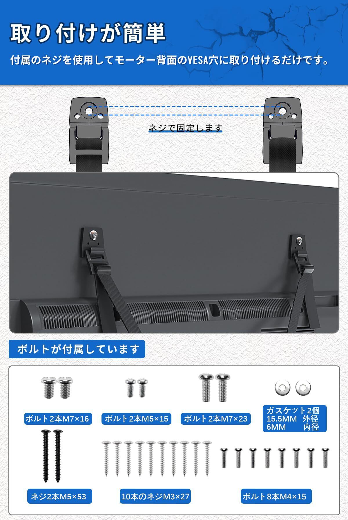 【壁固定対応】取り付けはテレビ背面のVESA穴(壁掛けネジ穴)に付属の小ネジで固定できます。 各種サイズの小ネジが付属しておりますので、お届け後すぐに取り付け可能です。 固定用のC型クリップは金属製なので、テレビキャビネットや壁にしっかりと固定できます。 地震ストッパーとして、家具や本棚の固定にも大変便利な耐震アイテムです。