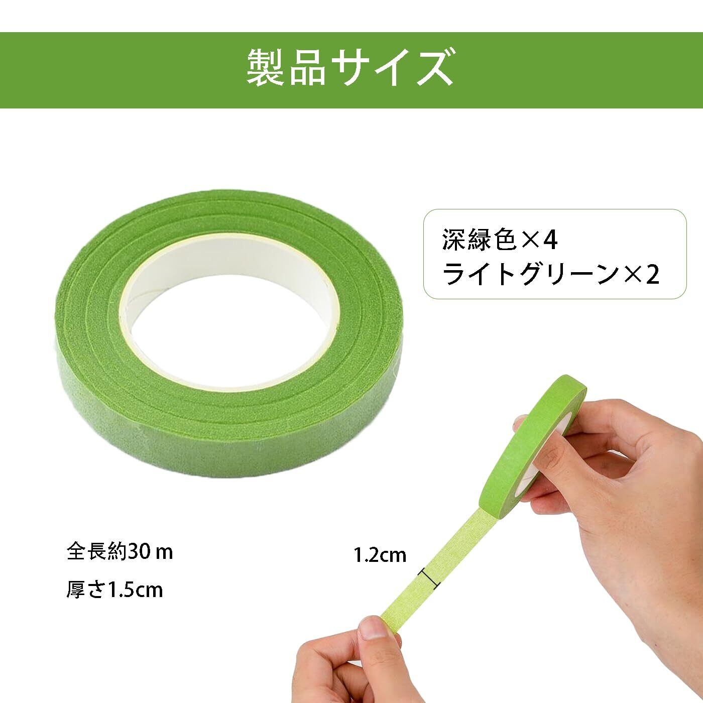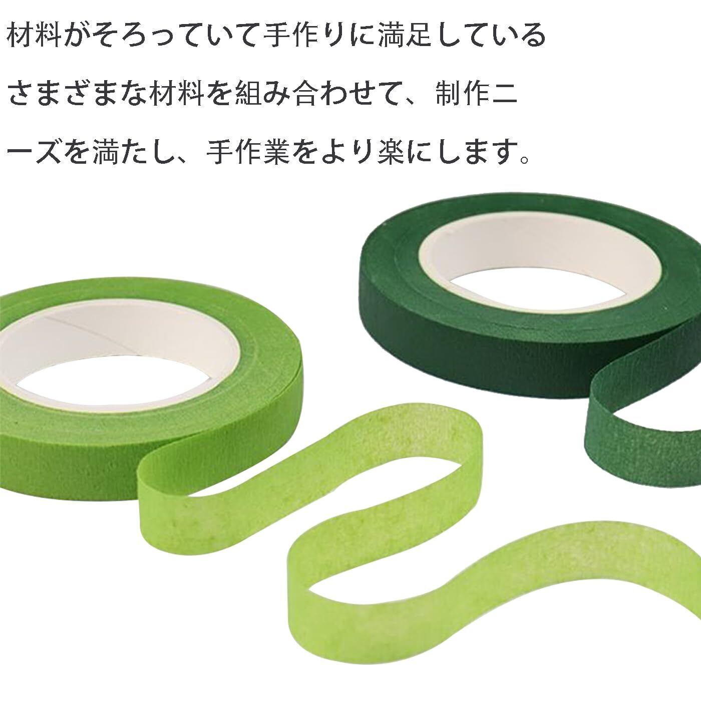 【豊富なセット内容】:本製品は4巻の濃い緑色と2巻の薄い緑色の良質な花芸テープを含み、多種の色彩需要を満たし、花芸創作にもっと多くの選択肢を提供する。