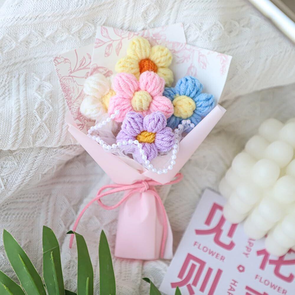 「 手作り感満載のかわいらしいデザイン」:丁寧に編まれた可愛らしい小さな花束です。編み目の細かさと手作り感が、受け取る人に温かさと特別感を与えます。見た目は美しくてかわいいし、枯れずに永遠に楽しめます。