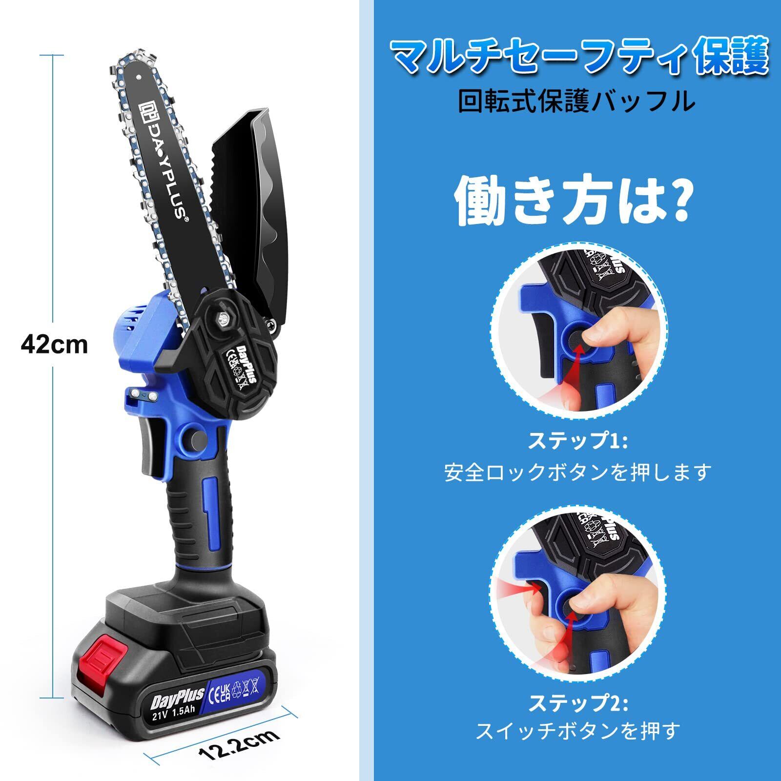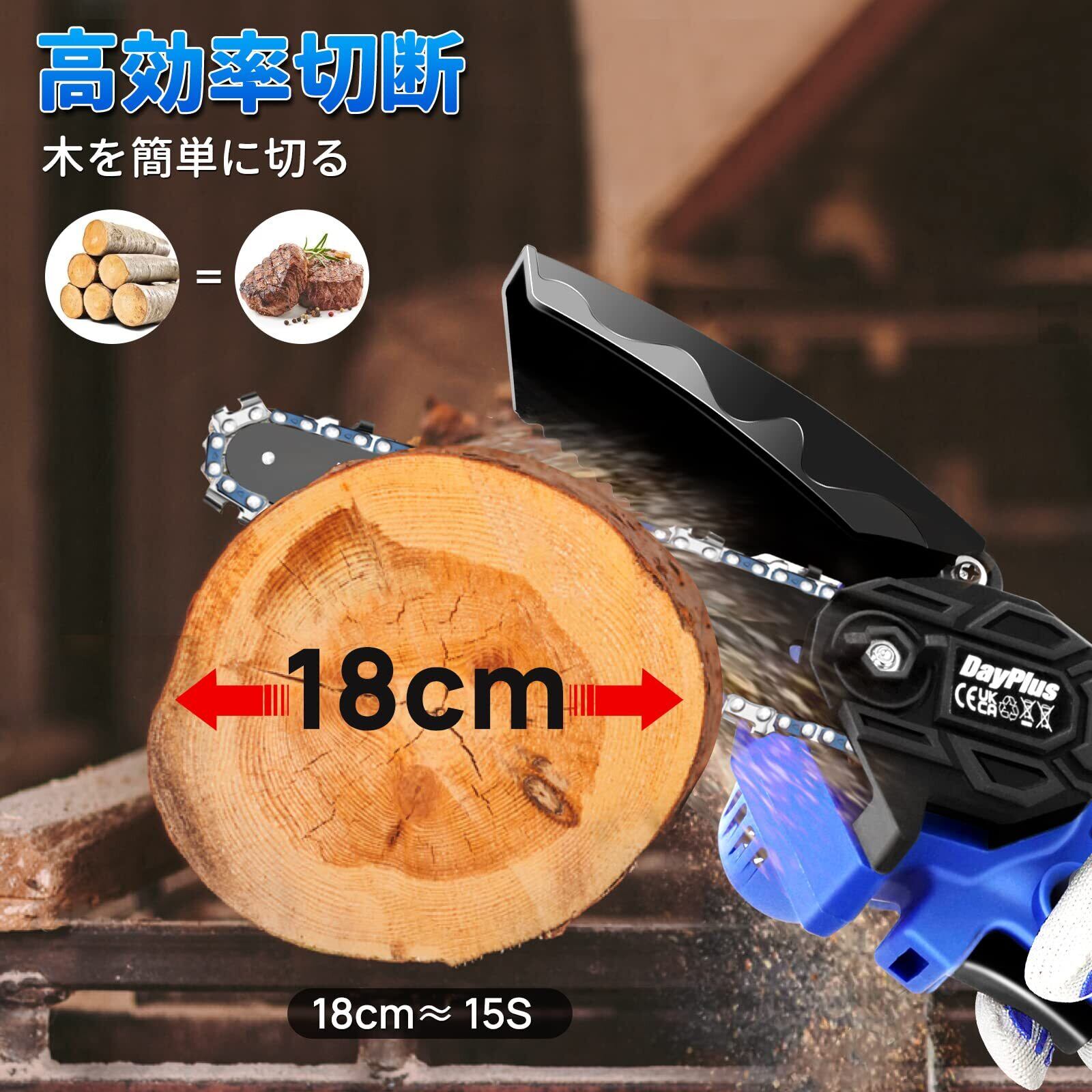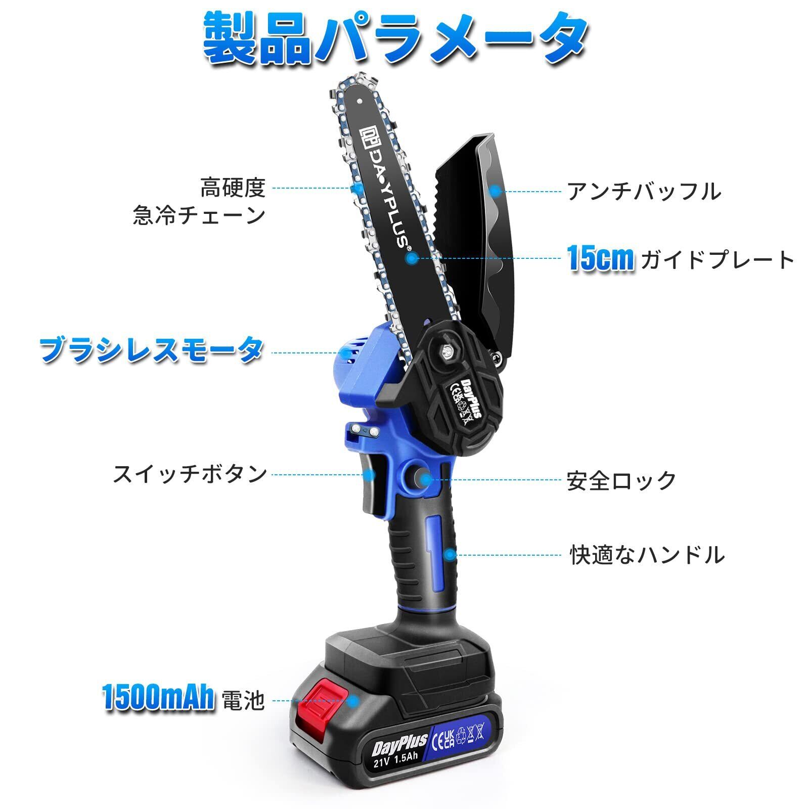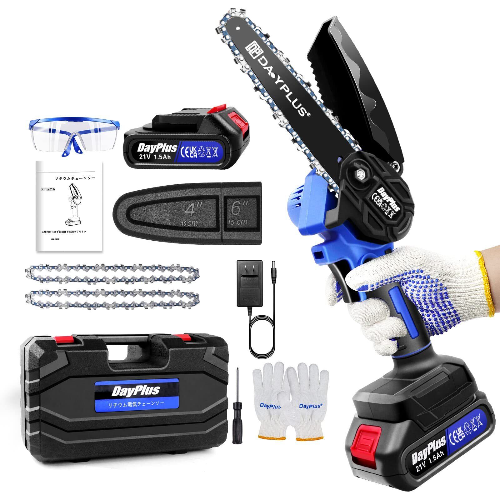 DayPlus コードレスチェンソー なブラシレスモーター21V/マキタ対応18Vバッテリー互換 バッテリ搭載 6インチ電動チェーンソー 小型チェーンソー 強力 軽量 片手 木工切断、薪作り、園芸設備、枝切り、庭木の剪定等 充電式電動のこぎり 日本語取扱説明書付き