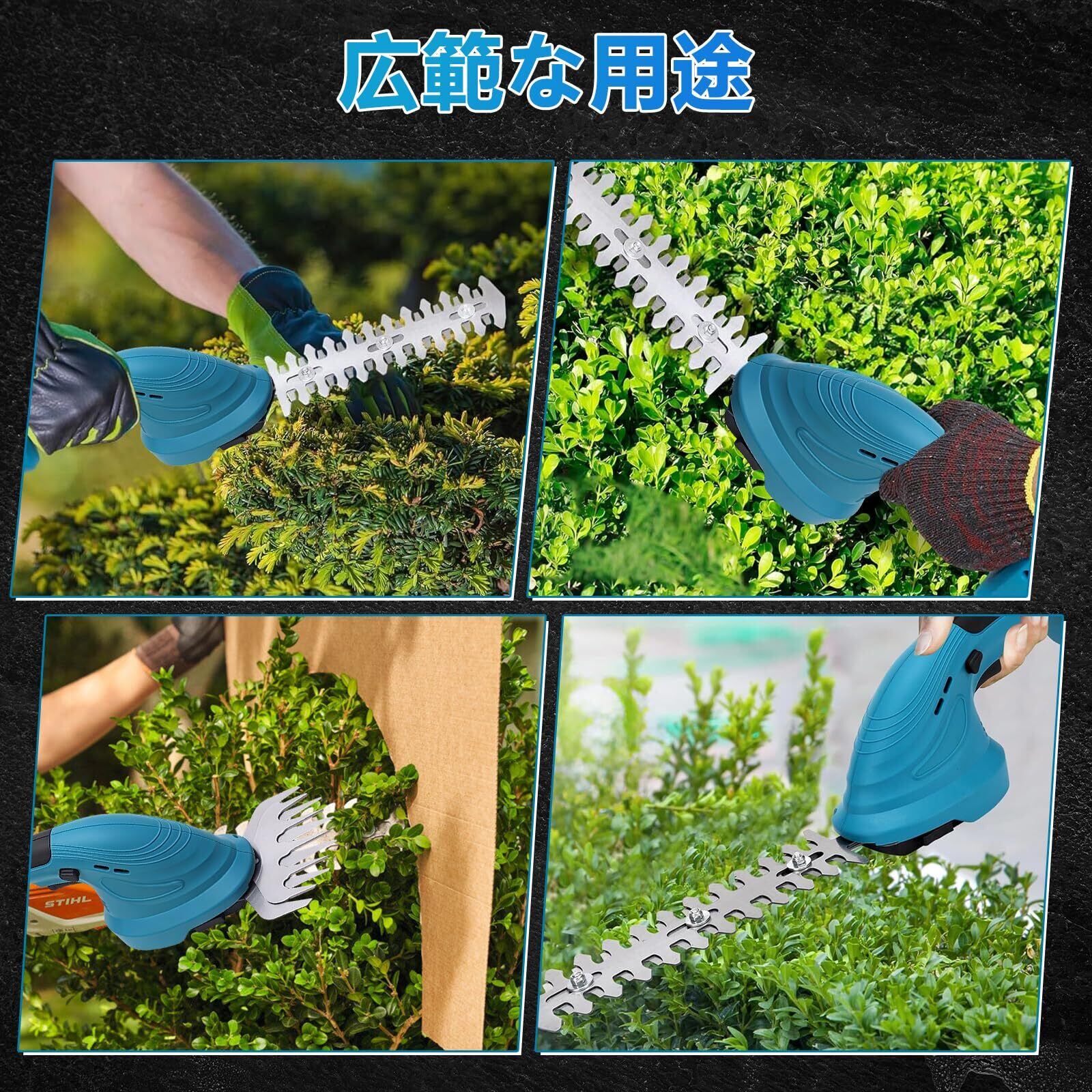 【二重ロック・安全安心】誤作動を起こしにくくする機能「トリガーロック機能」があり、剪定 トリマーは特別に装備された安全スイッチシステムは、スイッチボタンと安全ボタンを同時に押してこそ芝刈り機を起動することができ、意外な起動を効果的に防止し、操作の安全性を大幅に向上させ、園芸を楽しむと同時に、安心感を満たせることができます。ヘッジトリマーは広範な用途に対応しやすく、生垣、茂み、低木のトリミングから庭のメンテナンスまで幅広く活躍します。プラスチックと金属の材質を組み合わせた耐久性のある構造で、長く使える頼りになるアイテムです。